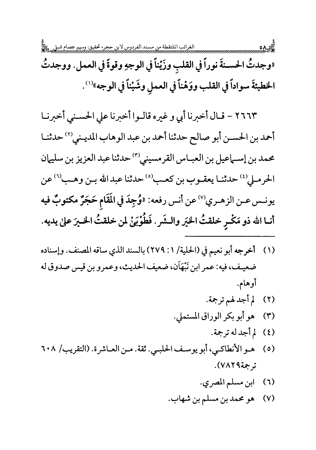 ٢٦٦٣ - قال أخبرنا أبي وغيره قالوا أخبرنا علي الحسني أخبرنا أحمد بن الحسن أبو صالح حدثنا أحمد بن عبد الوهاب المديني (¬٢) حدثنا محمد بن إسماعيل بن العباس القرمسيني (¬٣) حدثنا عبد العزيز بن سليمان الحرملي (¬٤) حدثنا يعقوب بن كعب (¬٥) حدثنا عبد الله بن وهب (¬٦) عن يونس عن الزهري (¬٧) عن أنس رفعه: "وُجِدَ في المَقَامِ حَجَرٌ مكتوبٌ فيه أنا الله ذو مَكْرٍ خلقتُ الخيَر والشَر. فَطُوْبَىْ لمن خلقتُ الخيرَ على يديه.