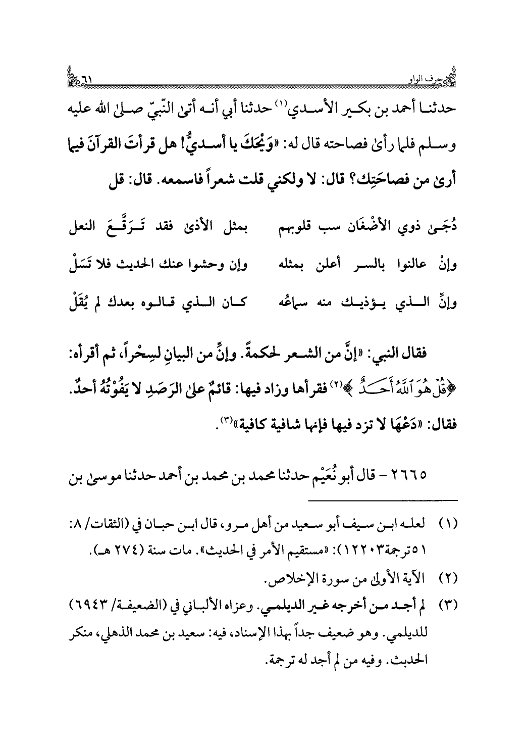 فقال النبي: "إنَّ من الشعر لحكمةً. وإنِّ من البيانِ لسِحْرًا، ثم أقرأه: {قُلْ هُوَ اللَّهُ أَحَدٌ} (¬٢) فقرأها وزاد فيها: قائمٌ على الرَصَدِ لا يَفُوْتُهُ أحدٌ. فقال: "دَعْهَا لا تزد فيها فإنها شافية كافية" (¬٣).