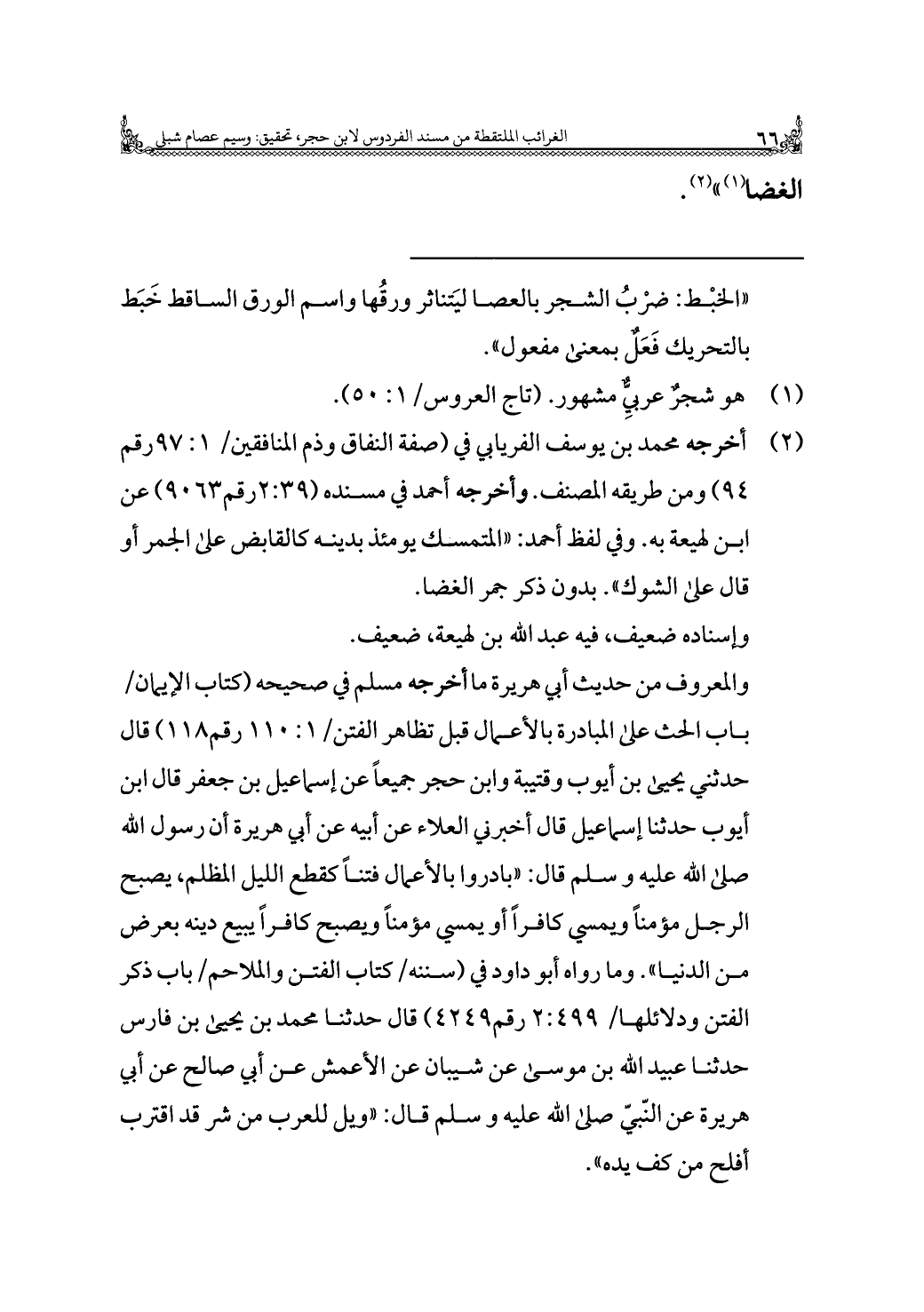 (¬٢) أخرجه محمد بن يوسف الفريابي في (صفة النفاق وذم المنافقين/ ١: ٩٧ رقم ٩٤) ومن طريقه المصنف. وأخرجه أحمد في مسنده (٣٩: ٢ رقم ٩٠٦٣) عن ابن لهيعة به. وفي لفظ أحمد: "المتمسك يومئذ بدينه كالقابض على الجمر أو قال على الشوك". بدون ذكر جمر الغضا.