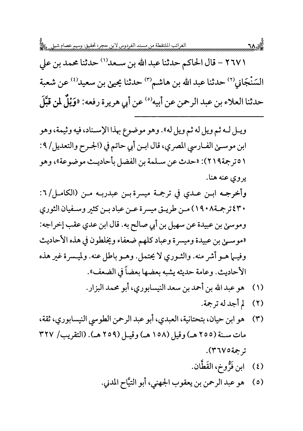 ٢٦٧١ - قال الحاكم حدثنا عبد الله بن سعد (¬١) حدثنا محمد بن علي السَنْجَاني (¬٢) حدثنا عبد الله بن هاشم (¬٣) حدثنا يحيى بن سعيد (¬٤) عن شعبة حدثنا العلاء بن عبد الرحمن عن أبيه (¬٥) عن أبي هريرة رفعه: "وَيْلٌ لمن قبَّلَ