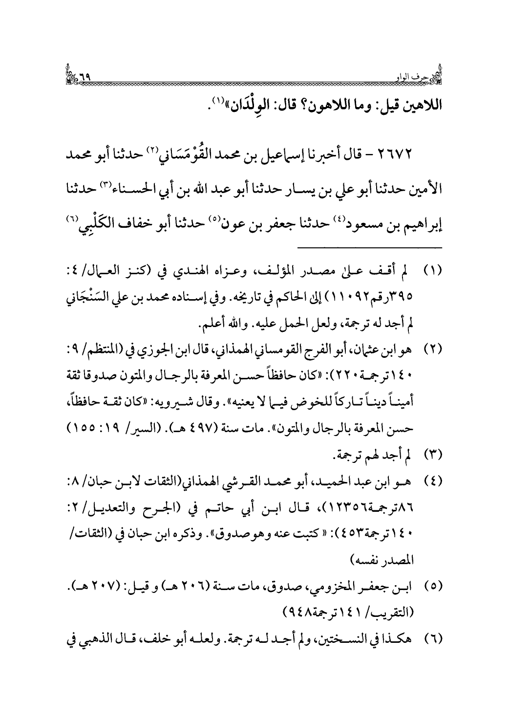 (¬٤) هو ابن عبد الحميد، أبو محمد القرشي الهمذاني (الثقات لابن حبان/ ٨: ٨٦ ترجمة ١٢٣٥٦)، قال ابن أبي حاتم في (الجرح والتعديل/ ٢: ١٤٠ ترجمة ٤٥٣): "كتبت عنه وهو صدوق". وذكره ابن حبان في (الثقات/ المصدر نفسه).