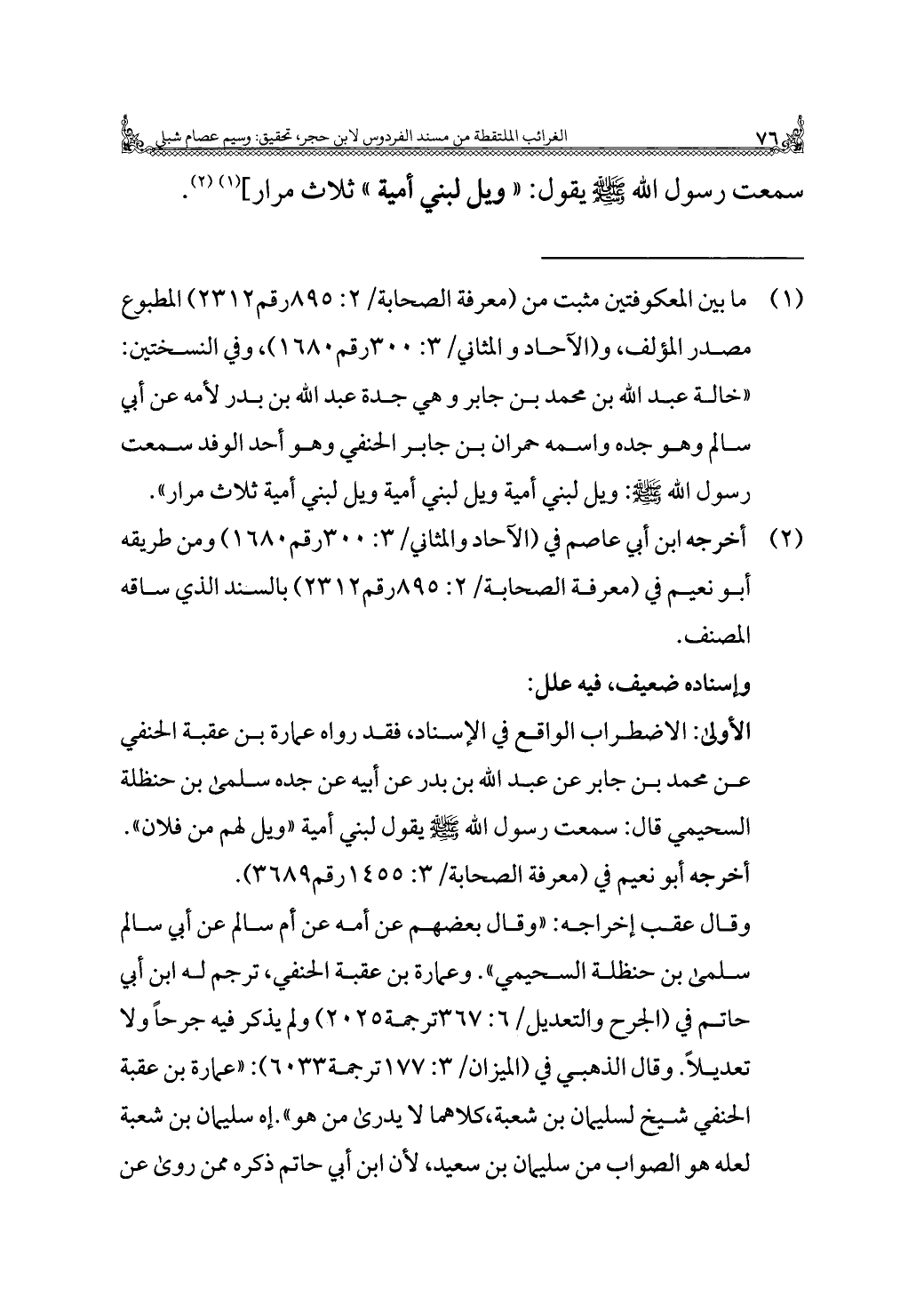 الأولى: الاضطراب الواقع في الإسناد، فقد رواه عمارة بن عقبة الحنفي عن محمد بن جابر عن عبد الله بن بدر عن أبيه عن جده سلمى بن حنظلة السحيمي قال: سمعت رسول الله -صلى الله عليه وسلم- يقول لبني أمية "ويل لهم من فلان".