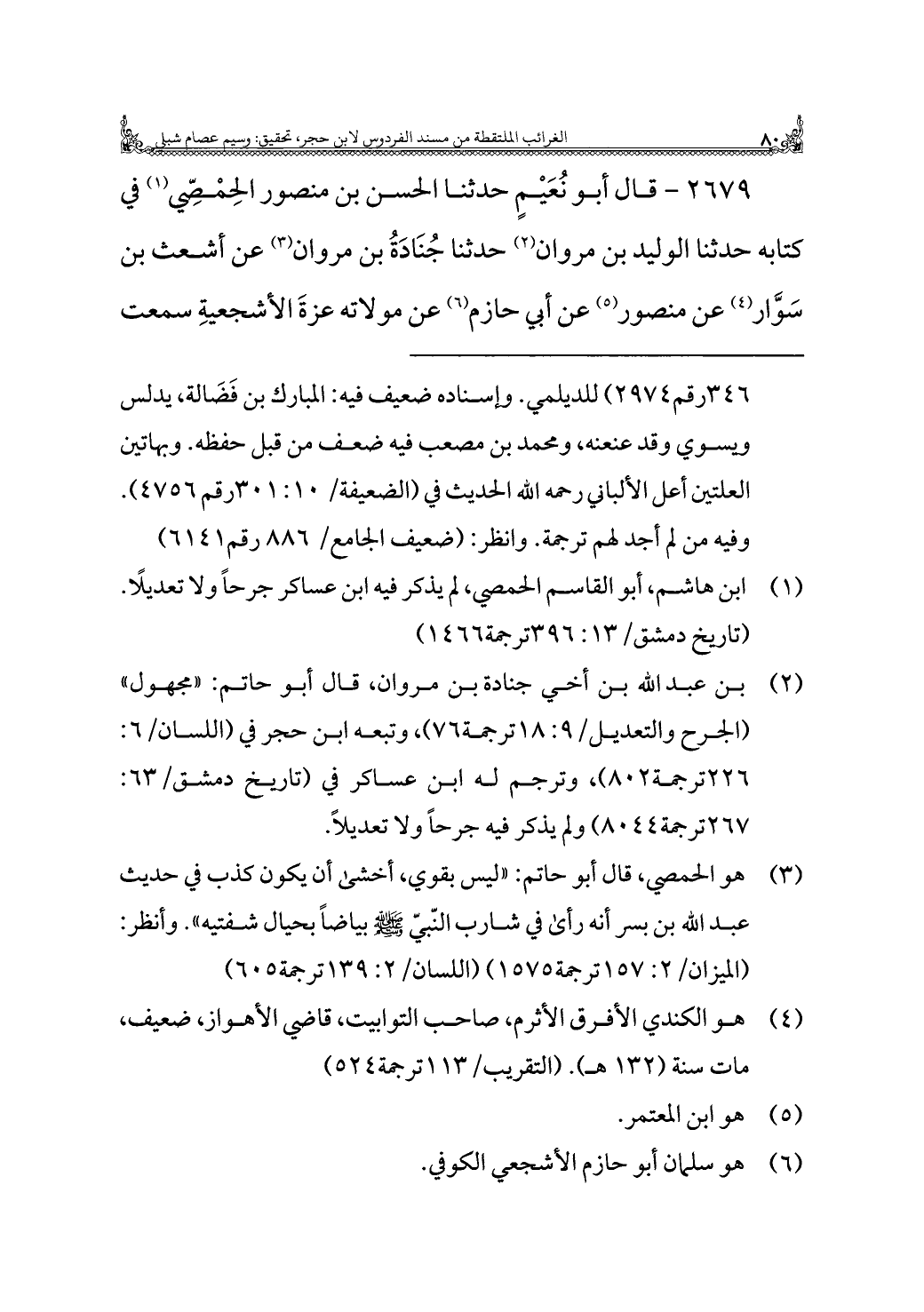 ٢٦٧٩ - قال أبو نُعَيْمٍ حدثنا الحسن بن منصور الحِمْصِّي (¬١) في كتابه حدثنا الوليد بن مروان (¬٢) حدثنا جُنَادَةُ بن مروان (¬٣) عن أشعث بن سَوَّار (¬٤) عن منصور (¬٥) عن أبي حازم (¬٦) عن مولاته عزةَ الأشجعيةِ سمعت
