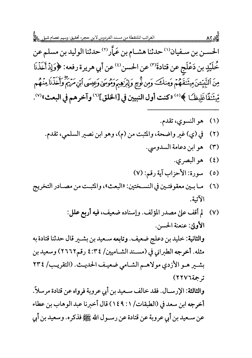 الحسن بن سفيان (¬١) حدثنا هشام بن عَمَّار (¬٢) حدثنا الوليد بن مسلم عن خُلَيْدٍ بن دَعْلَجٍ عن قتادةَ (¬٣) عن الحسن (¬٤) عن أبي هريرة رفعه: {وَإِذْ أَخَذْنَا مِنَ النَّبِيِّينَ مِيثَاقَهُمْ وَمِنْكَ وَمِنْ نُوحٍ وَإِبْرَاهِيمَ وَمُوسَى وَعِيسَى ابْنِ مَرْيَمَ وَأَخَذْنَا مِنْهُمْ مِيثَاقًا غَلِيظًا} (¬٥) "كنت أول النبيين في [الخلق] (¬٦) وآخرهم في البعث" (¬٧).