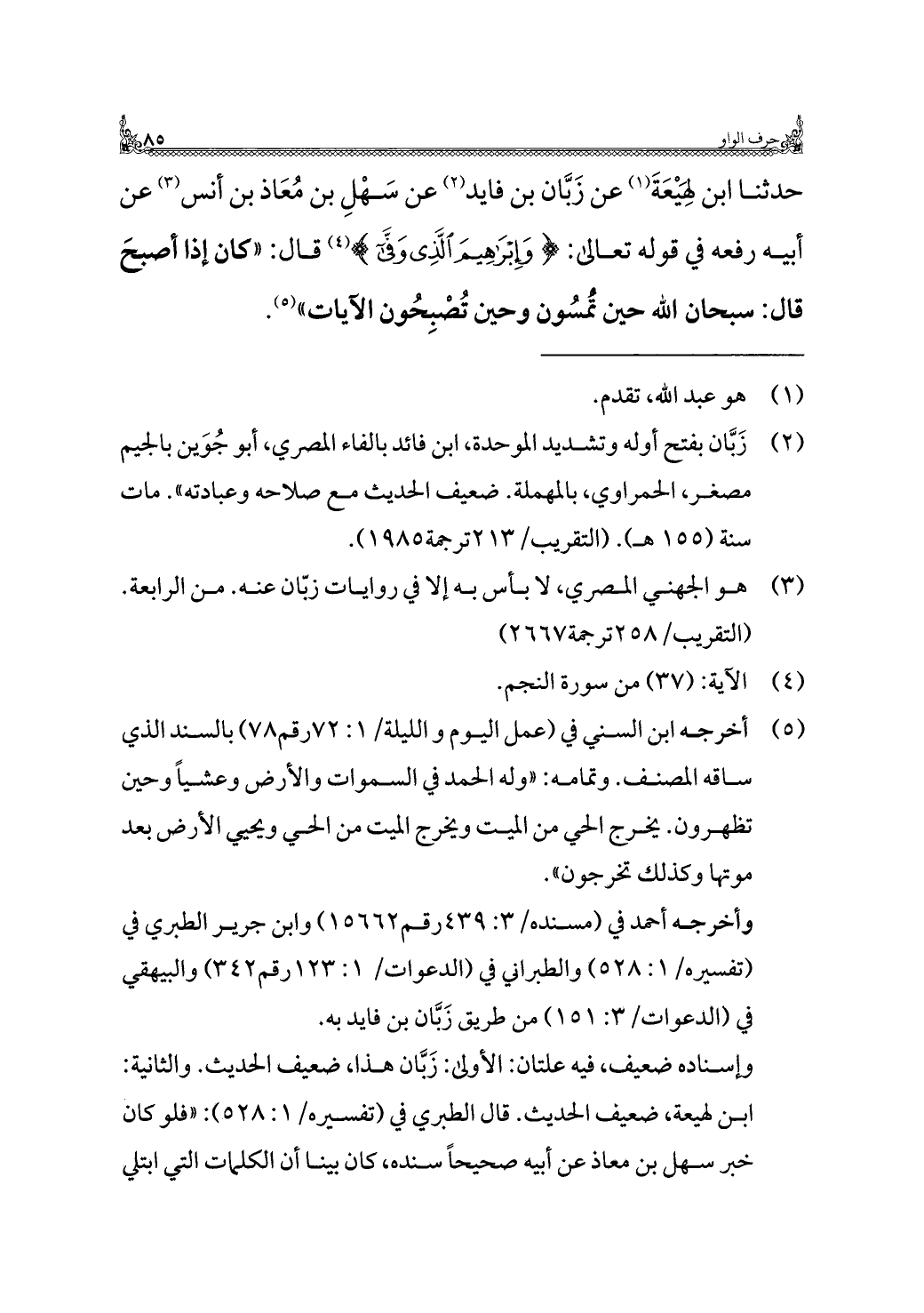(¬٥) أخرجه ابن السني في (عمل اليوم والليلة/ ١: ٧٢ رقم ٧٨) بالسند الذي ساقه المصنف. وتمامه: "وله الحمد في السموات والأرض وعشيًا وحين تظهرون. يخرج الحي من الميت ويخرج الميت من الحي ويحيي الأرض بعد موتها وكذلك تخرجون".