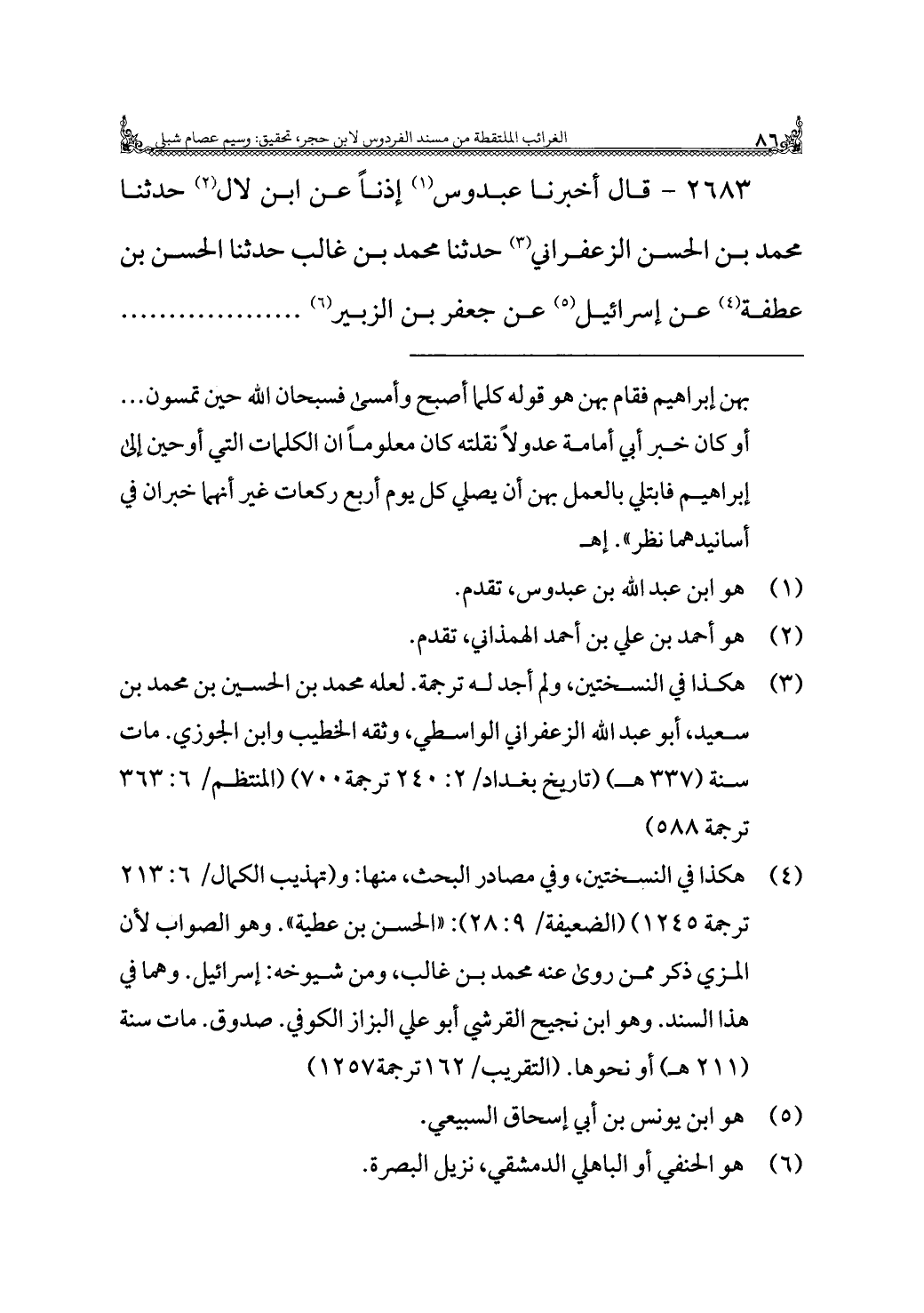 ٢٦٨٣ - قال أخبرنا عبدوس (¬١) إذنًا عن ابن لال (¬٢) حدثنا محمد بن الحسن الزعفراني (¬٣) حدثنا محمد بن غالب حدثنا الحسن بن عطفة (¬٤) عن إسرائيل (¬٥) عن جعفر بن الزبير (¬٦) ....................