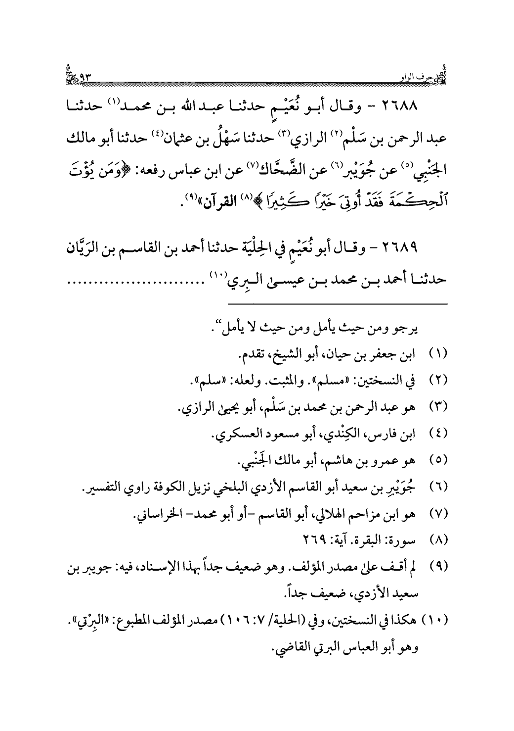 ٢٦٨٨ - وقال أبو نُعَيْمٍ حدثنا عبد الله بن محمد (¬١) حدثنا عبد الرحمن بن سَلْم (¬٢) الرازي (¬٣) حدثنا سَهْلُ بن عثمان (¬٤) حدثنا أبو مالك الجَنْبِي (¬٥) عن جُوَيْبر (¬٦) عن الضَّحَّاك (¬٧) عن ابن عباس رفعه: {وَمَنْ يُؤْتَ الْحِكْمَةَ فَقَدْ أُوتِيَ خَيْرًا كَثِيرًا} (¬٨) القرآن" (¬٩).