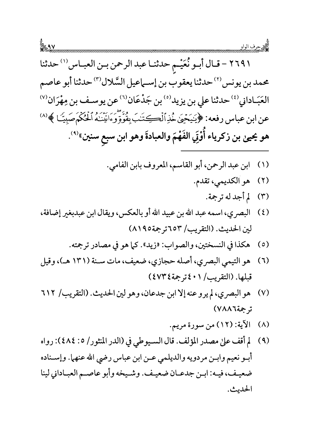 ٢٦٩١ - قال أبو نُعَيْمٍ حدثنا عبد الرحمن بن العباس (¬١) حدثنا محمد بن يونس (¬٢) حدثنا يعقوب بن إسماعيل السَّلال (¬٣) حدثنا أبو عاصم العَبَاداني (¬٤) حدثنا علي بن يزيد (¬٥) بن جَدْعَان (¬٦) عن يوسف بن مِهْرَان (¬٧) عن ابن عباس رفعه: {يَايَحْيَى خُذِ الْكِتَابَ بِقُوَّةٍ وَآتَيْنَاهُ الْحُكْمَ صَبِيًّا} (¬٨) هو يحيى بن زكرياء أُوْتِي الفَهْمَ والعبادةَ وهو ابن سبعِ سنين" (¬٩).