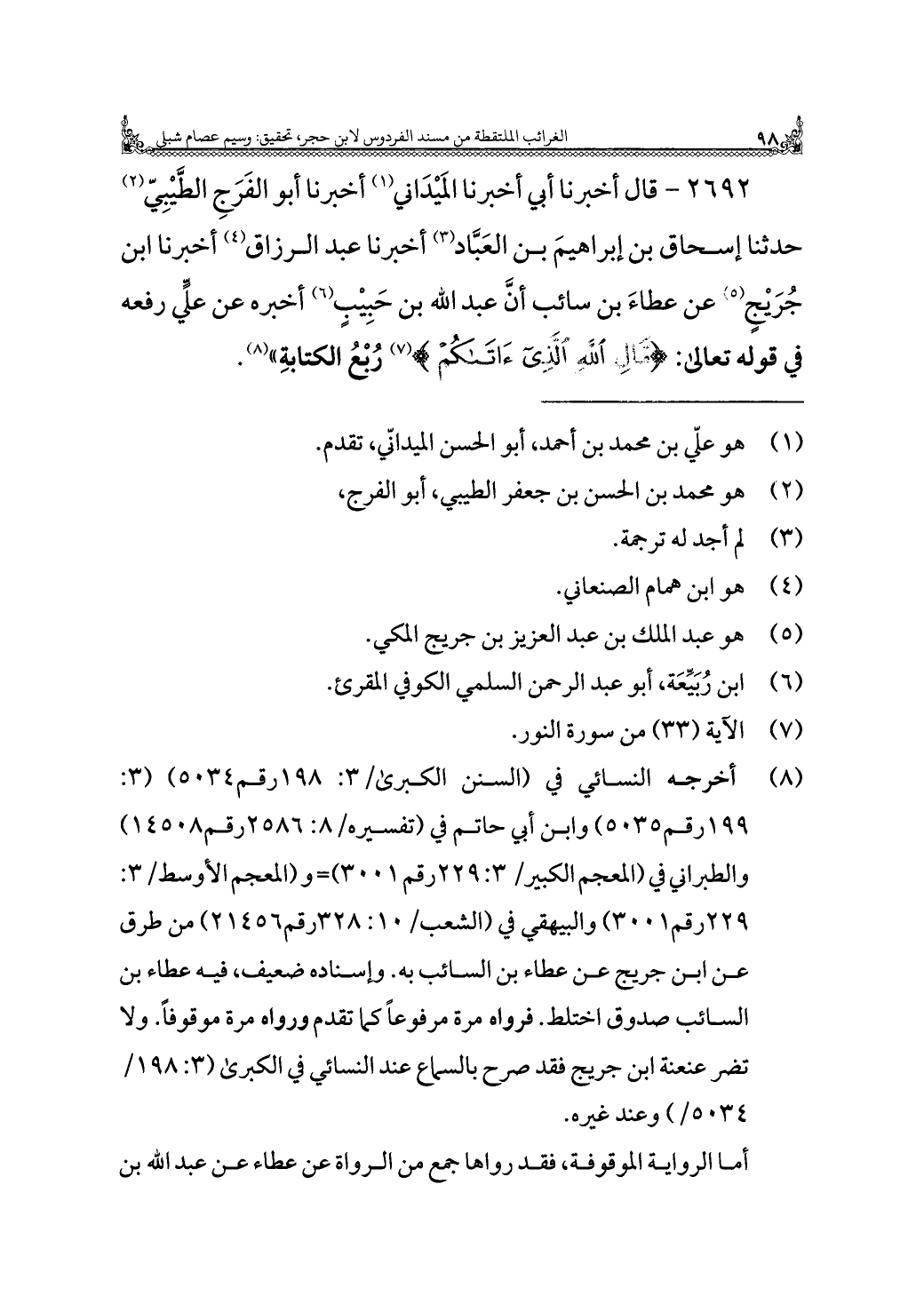 ٢٦٩٢ - قال أخبرنا أبي أخبرنا المَيْدَاني (¬١) أخبرنا أبو الفَرَجِ الطَّيْبِيّ (¬٢) حدثنا إسحاق بن إبراهيمَ بن العَبَّاد (¬٣) أخبرنا عبد الرزاق (¬٤) أخبرنا ابن جُرَيْجٍ (¬٥) عن عطاءَ بن سائب أنَّ عبد الله بن حَبِيْبٍ (¬٦) أخبره عن علي رفعه في قوله تعالى: {مَالِ اللَّهِ الَّذِي آتَاكُمْ} (¬٧) رُبْعُ الكتابةِ" (¬٨).