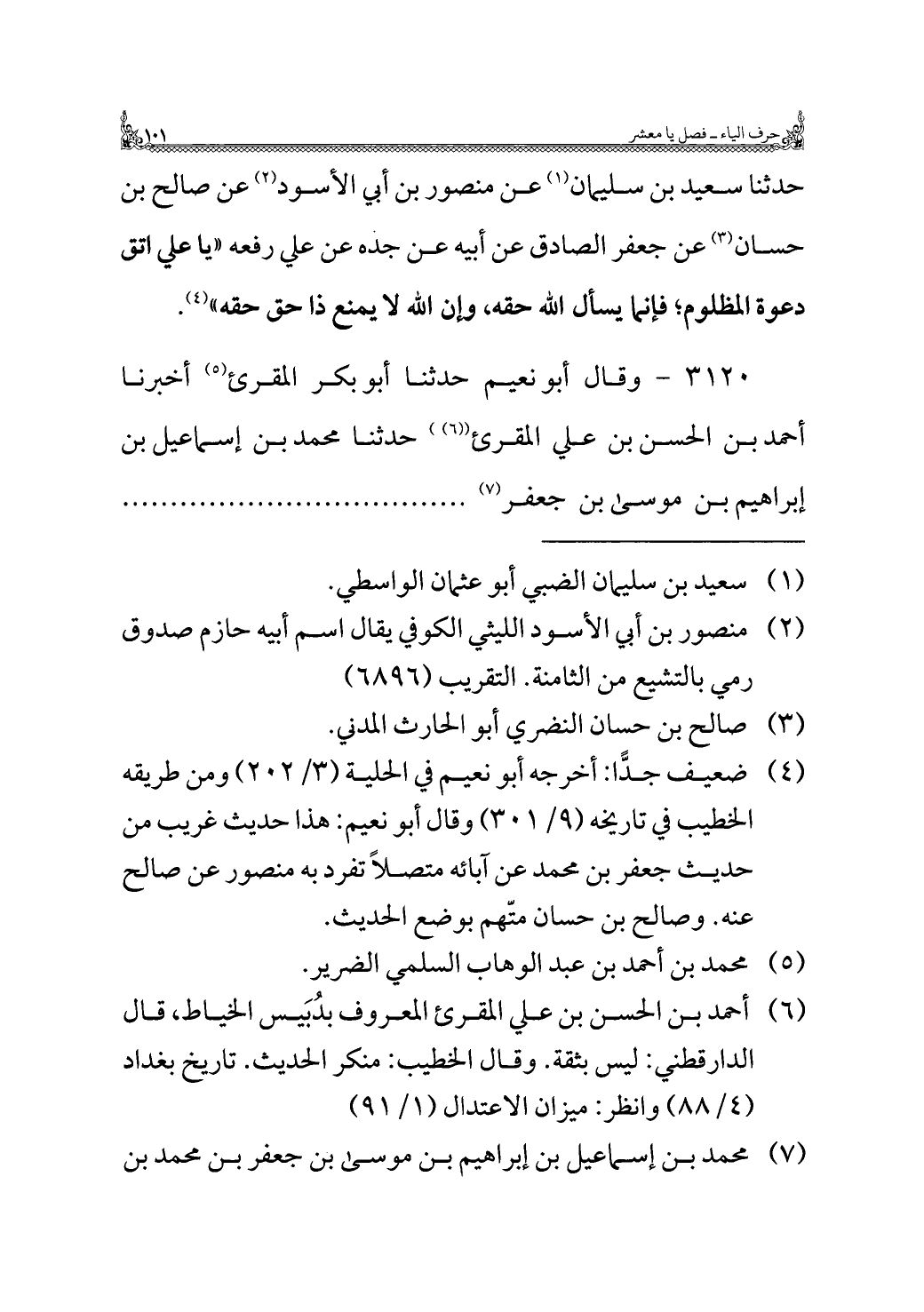 ٣١٢٠ - وقال أبو نعيم حدثنا أبو بكر المقرئ (¬٥) أخبرنا أحمد بن الحسن بن علي المقرئ ((¬٦)) حدثنا محمد بن إسماعيل بن إبراهيم بن موسى بن جعفر (¬٧). . . . . .