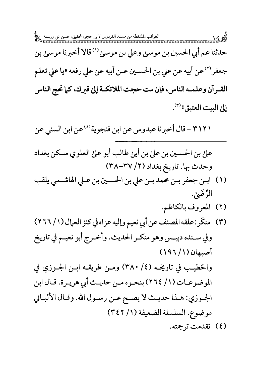 حدثنا عم أبي الحسين بن موسى وعلي بن موسى (¬١) قالا أخبرنا موسى بن جعفر (¬٢) عن أبيه عن علي بن الحسين عن أبيه عن علي رفعه "يا علي تعلم القرآن وعلمه الناس، فان مت حجت الملائكة إلى قبرك، كما تحج الناس إلى البيت العتيق" (¬٣).