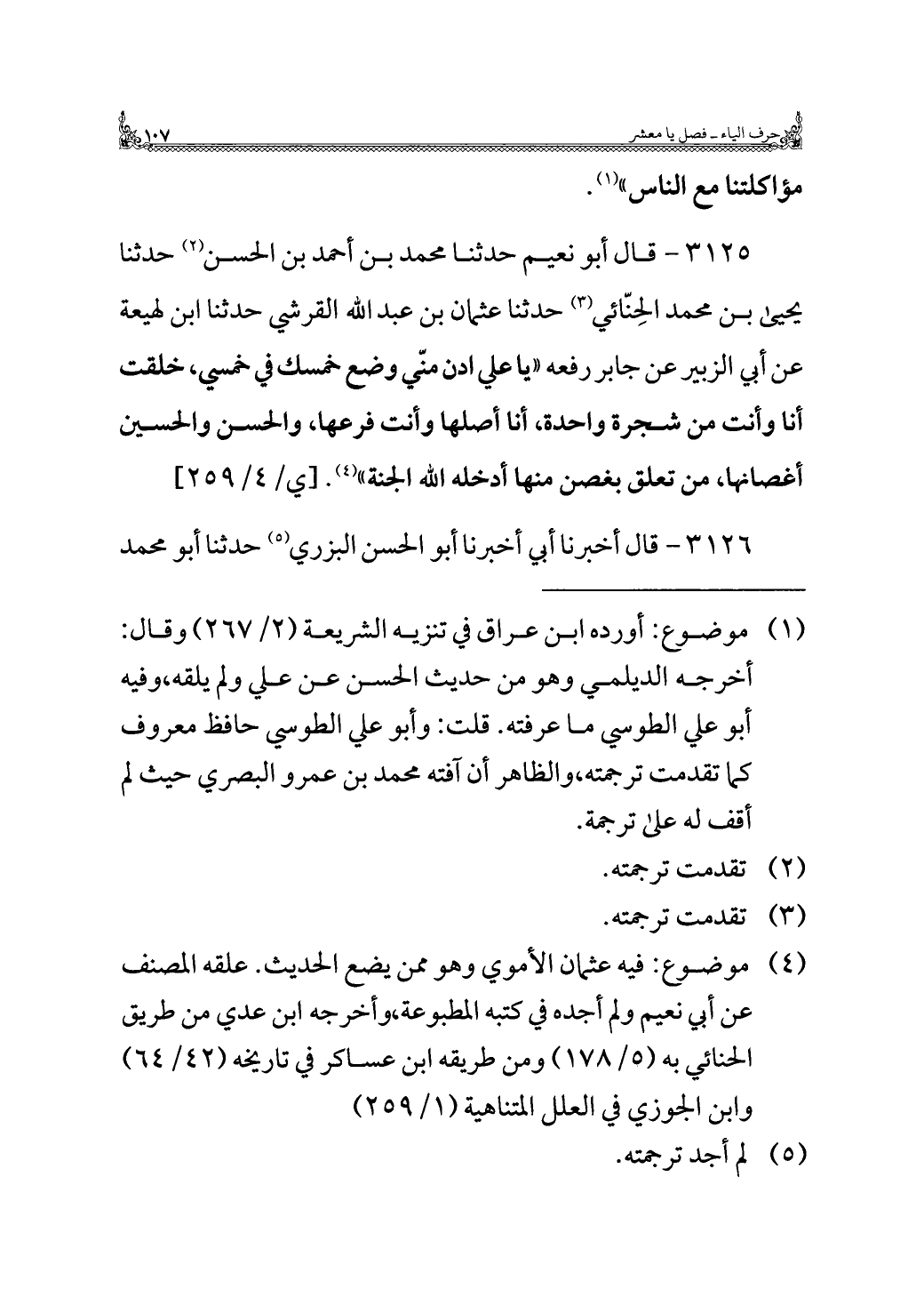 ٣١٢٥ - قال أبو نعيم حدثنا محمد بن أحمد بن الحسن (¬٢) حدثنا يحيى بن محمد الحِنّائي (¬٣) حدثنا عثمان بن عبد الله القرشي حدثنا ابن لهيعة عن أبي الزبير عن جابر رفعه "يا علي ادن منّي وضع خمسك في خمسي، خلقت أنا وأنت من شجرة واحدة، أنا أصلها وأنت فرعها، والحسن والحسين أغصانها، من تعلق بغصن منها أدخله الله الجنة" (¬٤).