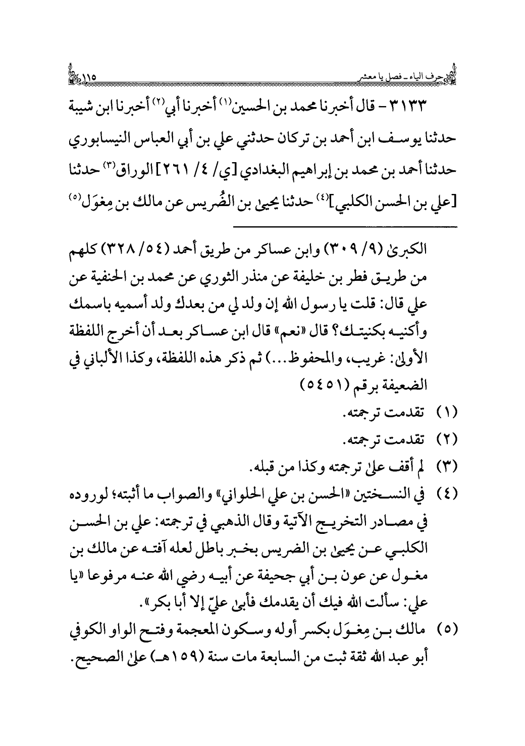 ٣١٣٣ - قال أخبرنا محمد بن الحسين (¬١) أخبرنا أبي (¬٢) أخبرنا ابن شيبة حدثنا يوسف بن أحمد بن تركان حدثني علي بن أبي العباس النيسابوري حدثنا أحمد بن محمد بن إبراهيم البغدادي الوراق (¬٣) حدثنا [علي بن الحسن الكلبي] (¬٤) حدثنا يحيى بن الضُريس عن مالك بن مِغوَل (¬٥)
