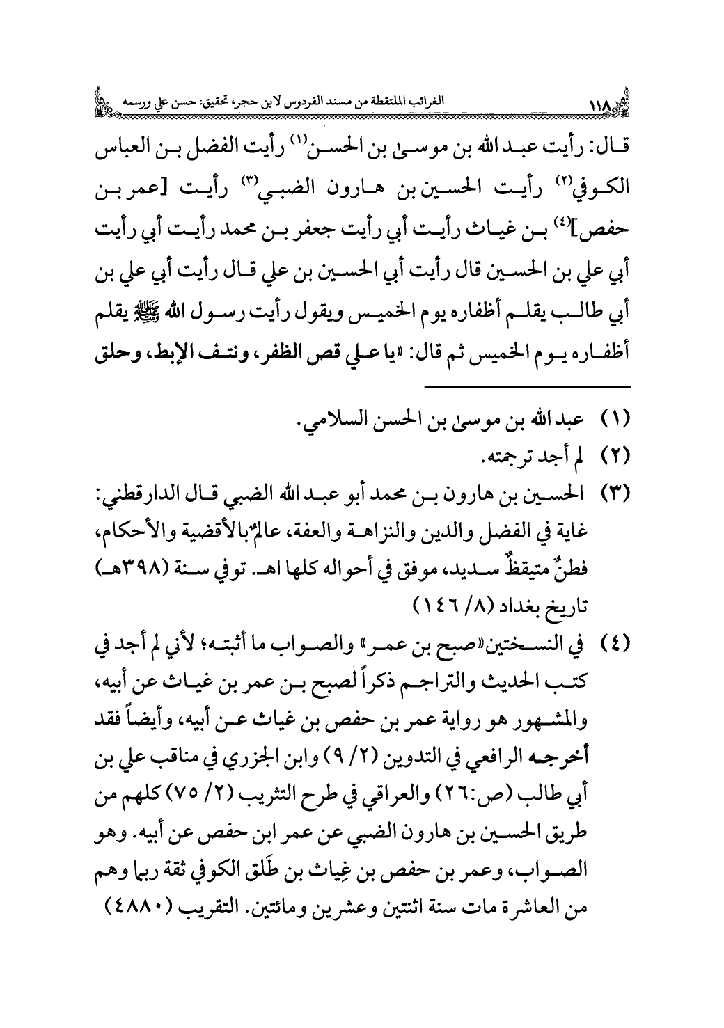 (¬٤) في النسختين "صبح بن عمر" والصواب ما أثبته؛ لأني لم أجد في كتب الحديث والتراجم ذكرًا لصبح بن عمر بن غياث عن أبيه، والمشهور هو رواية عمر بن حفص بن غياث عن أبيه، وأيضًا فقد أخرجه الرافعي في التدوين (٢/ ٩) وابن الجزري في مناقب علي بن أبي طالب (ص: ٢٦) والعراقي في طرح التثريب (٢/ ٧٥) كلهم من طريق الحسين بن هارون الضبي عن عمر بن حفص عن أبيه. وهو الصواب، وعمر بن حفص بن غِياث بن طَلق الكوفي ثقة ربما وهم من العاشرة مات سنة اثنتين وعشرين ومائتين. التقريب (٤٨٨٠).
