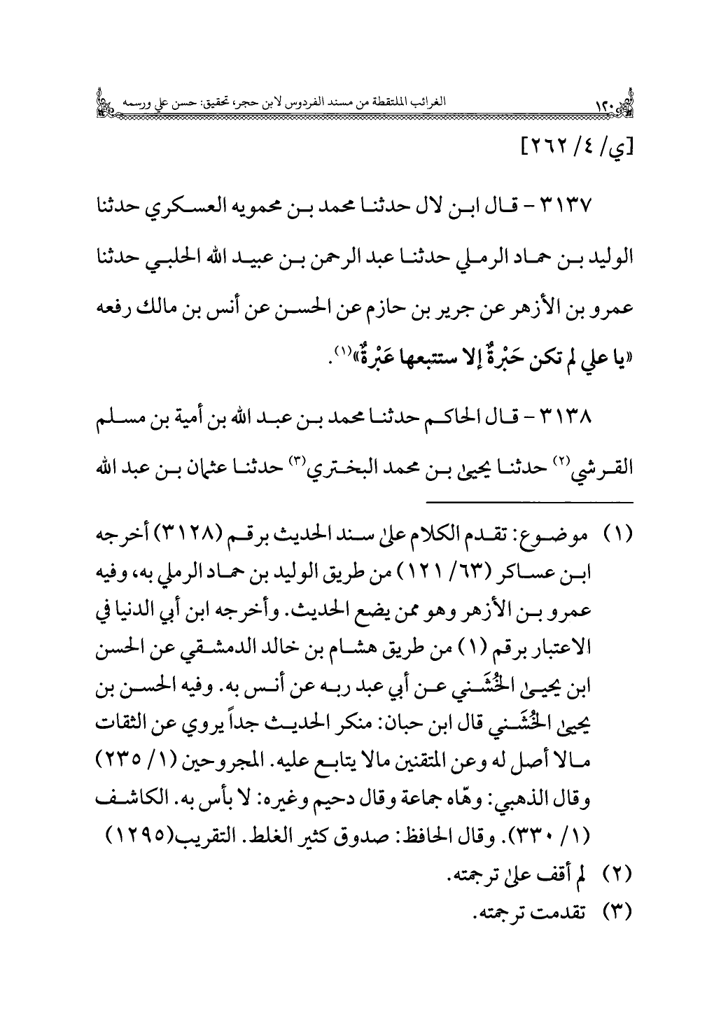 ٣١٣٧ - قال ابن لال حدثنا محمد بن محمويه العسكري حدثنا الوليد بن حماد الرملي حدثنا عبد الرحمن بن عبيد الله الحلبي حدثنا عمرو بن الأزهر عن جرير بن حازم عن الحسن عن أنس بن مالك رفعه "يا علي لم تكن حَبْرةٌ إلا ستتبعها عَبْرةٌ" (¬١).