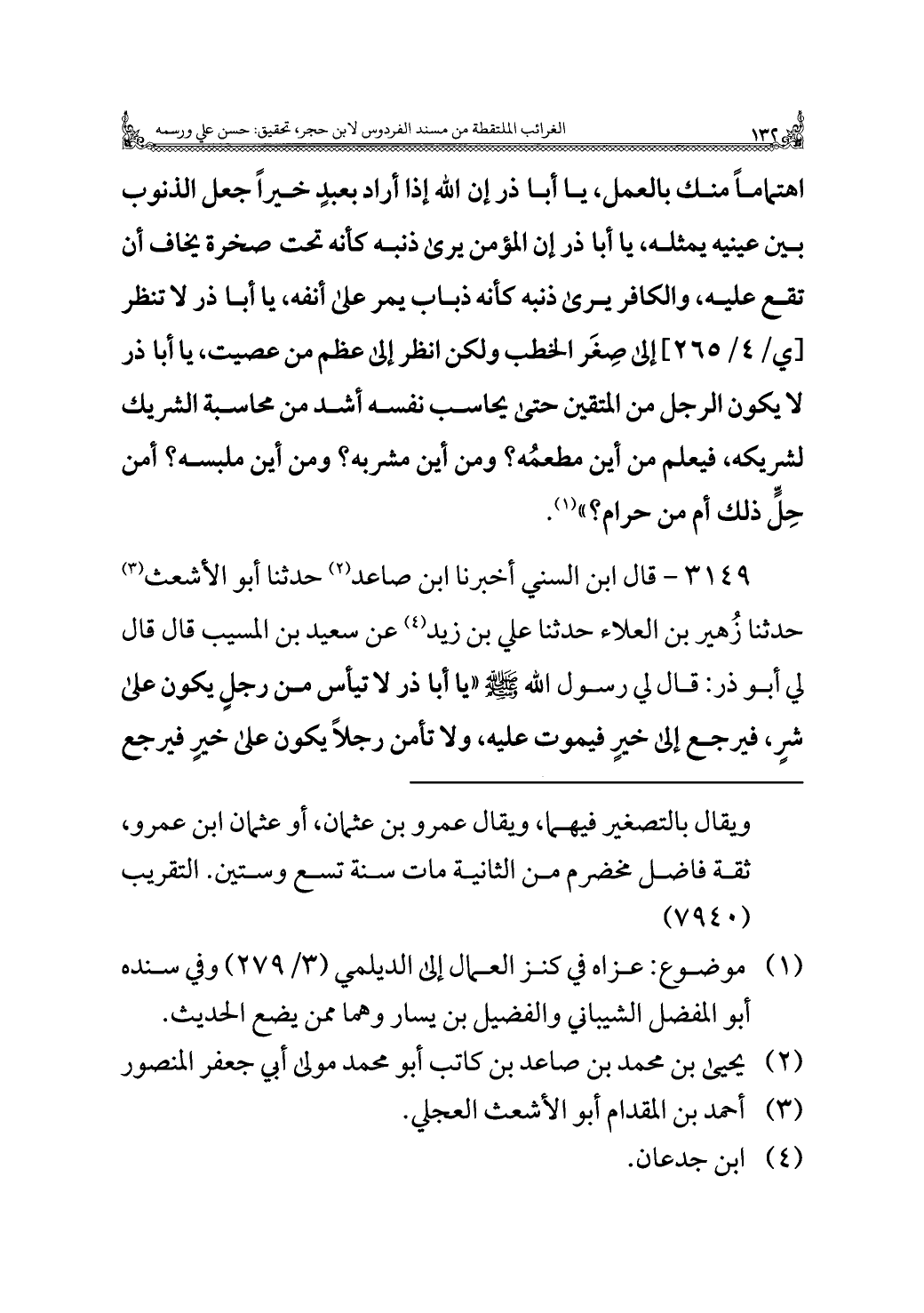 ٣١٤٩ - قال ابن السني أخبرنا ابن صاعد (¬٢) حدثنا أبو الأشعث (¬٣) حدثنا زُهير بن العلاء حدثنا علي بن زيد (¬٤) عن سعيد بن المسيب قال قال لي أبو ذر: قال لي رسول الله - صلى الله عليه وسلم - "يا أبا ذر لا تيأس من رجلٍ يكون على شرٍ، فيرجع إلى خيرٍ فيموت عليه، ولا تأمن رجلًا يكون على خيرٍ فيرجع