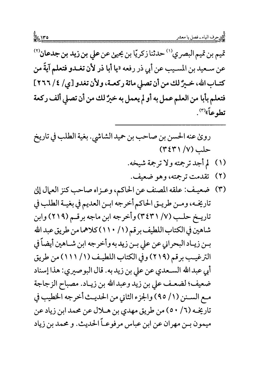 تميم بن تميم البصري (¬١) حدثنا زكريّا بن يحيى عن علي بن زيد بن جدعان (¬٢) عن سعيد بن المسيب عن أبي ذر رفعه "يا أبا ذر لأن تغدو فتعلم آيةً من كتاب الله، خيرٌ لك من أن تصلي مائة ركلعة، ولأن تغدو فتعلم بابا من العلم عمل به أو لم يعمل به خيرٌ لك من أن تصلي ألف ركعة تطوعًا" (¬٣).