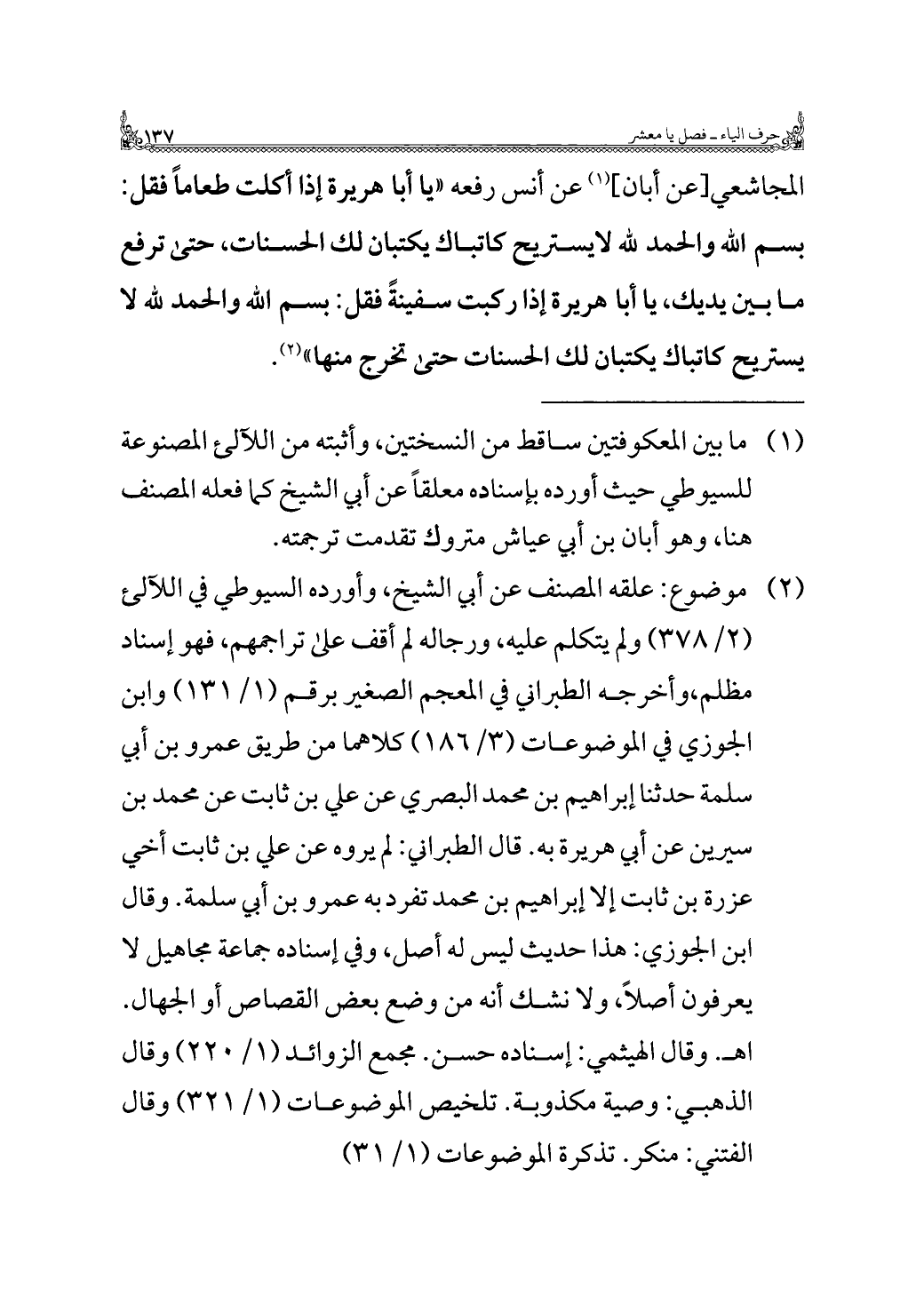 (¬١) ما بين المعكوفتين ساقط من النسختين، وأثبته من اللآلئ المصنوعة للسيوطي حيث أورده بإسناده معلقًا عن أبي الشيخ كما فعله المصنف هنا، وهو أبان بن أبي عياش متروك تقدمت ترجمته.