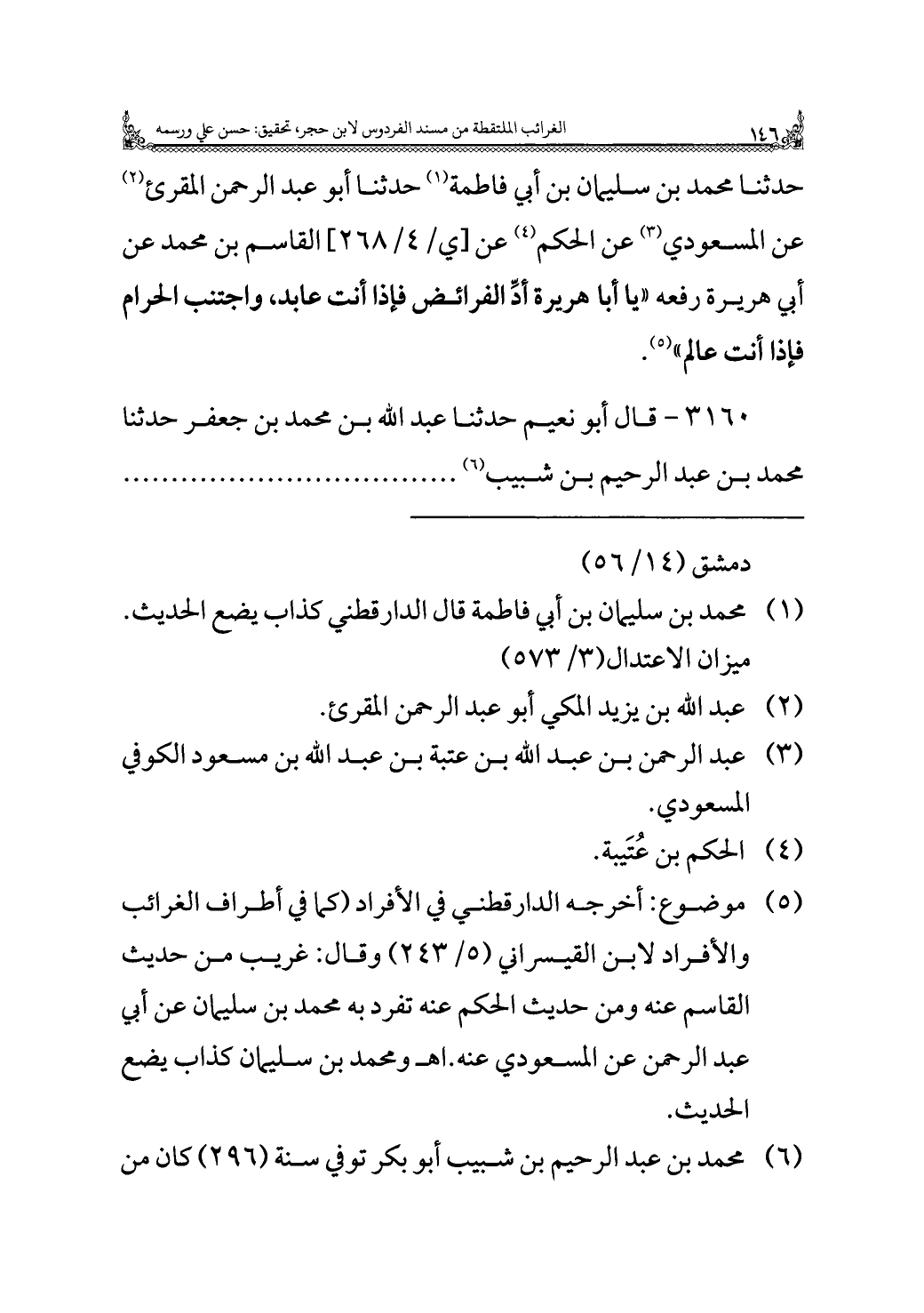 حدثنا محمد بن سليمان بن أبي فاطمة (¬١) حدثنا أبو عبد الرحمن المقرئ (¬٢) عن المسعودي (¬٣) عن الحكم (¬٤) عن القاسم بن محمد عن أبي هريرة رفعه "يا أبا هريرة أدِّ الفرائض فإذا أنت عابد، واجتنب الحرام فإذا أنت عالم" (¬٥).