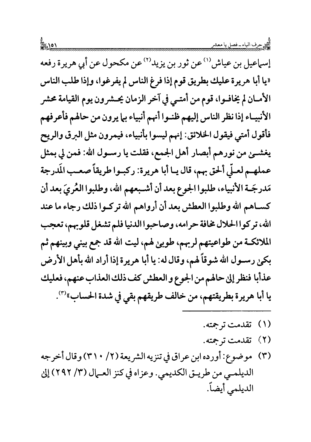 إسماعيل بن عياش (¬١) عن ثور بن يزيد (¬٢) عن مكحول عن أبي هريرة رفعه "يا أبا هريرة عليك بطريق قوم إذا فرغ الناس لم يفرغوا، وإذا طلب الناس الأمان لم يخافوا، قوم من أمتي في آخر الزمان يحشرون يوم القيامة محشر الأنبياء إذا نظر الناس إليهم ظنوا أنهم أنبياء بما يرون من حالهم فأعرفهم فأقول أمتي فيقول الخلائق: إنهم ليسوا بأنبياء، فيمرون مثل البرق والريح يغشى من نورهم أبصار أهل الجمع، فقلت يا رسول الله: فمن لي بمثل عملهم لعلّي ألحق بهم، قال يا أبا هريرة: ركبوا طريقًا صعب المَدرجة مَدرجَة الأنبياء، طلبوا الجوع بعد أن أشبعهم الله، وطلبوا العُريَ بعد أن كساهم الله وطلبوا العطش بعد أن أرواهم الله تركوا ذلك رجاء ما عند الله، تركوا الحلال مخافة حرامه، وصاحبوا الدنيا فلم تشغل قلوبهم، تعجب الملائكة من طواعيتهم لربهم، طوبى لهم، ليت الله قد جمع بيني وبينهم ثم بكى رسول الله شوقًا لهم، وقال له: يا أبا هريرة إذا أراد الله بأهل الأرض عذابًا فنظر إلى حالهم من الجوع والعطش كف ذلك العذاب عنهم، فعليك يا أبا هريرة بطريقتهم، من خالف طريقهم بقي في شدة الحساب" (¬٣).