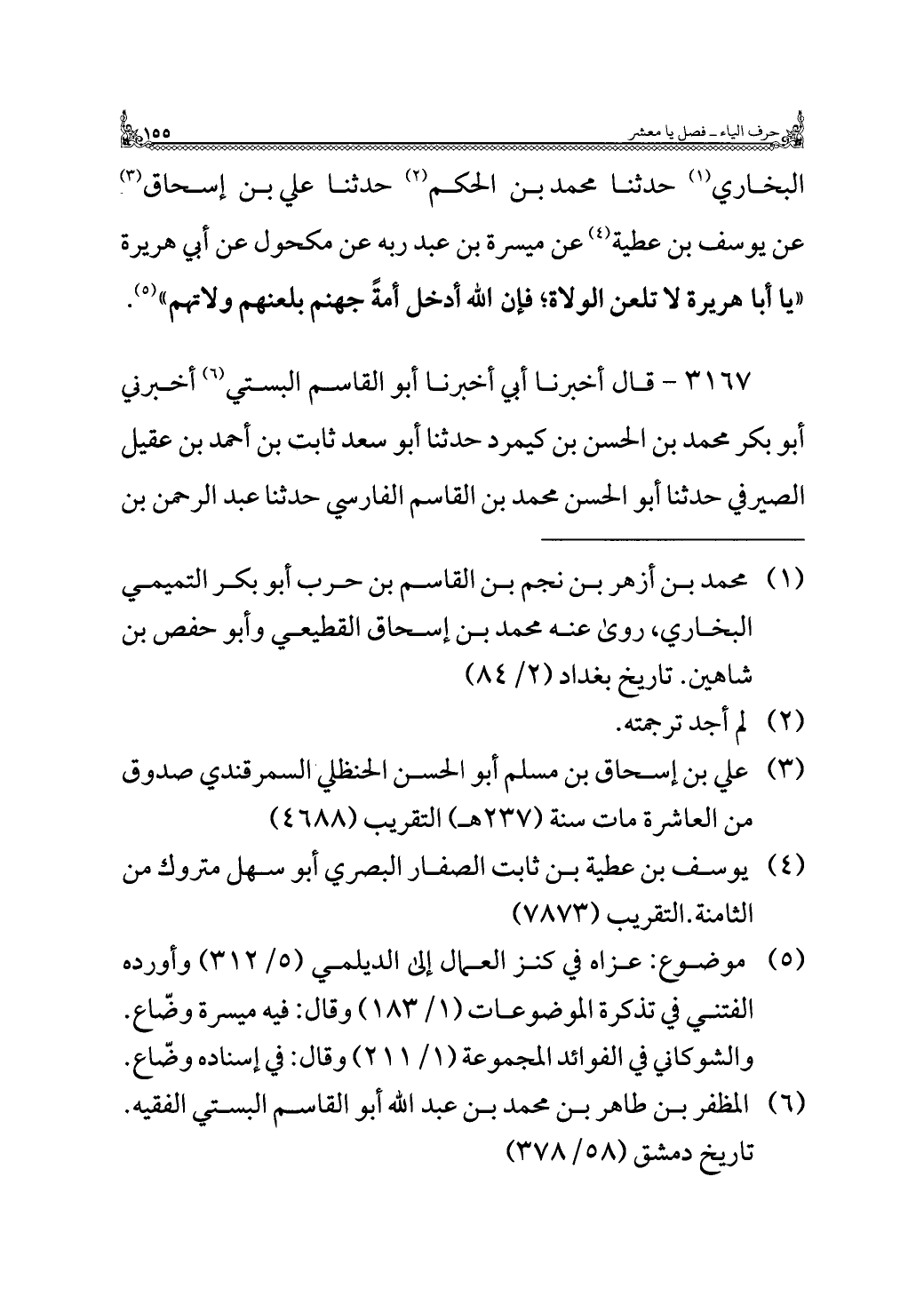 البخاري (¬١) حدثنا محمد بن الحكم (¬٢) حدثنا علي بن إسحاق (¬٣) عن يوسف بن عطية (¬٤) عن ميسرة بن عبد ربه عن مكحول عن أبي هريرة "يا أبا هريرة لا تلعن الولاة؛ فإن الله أدخل أمةً جهنم بلعنهم ولاتهم" (¬٥).