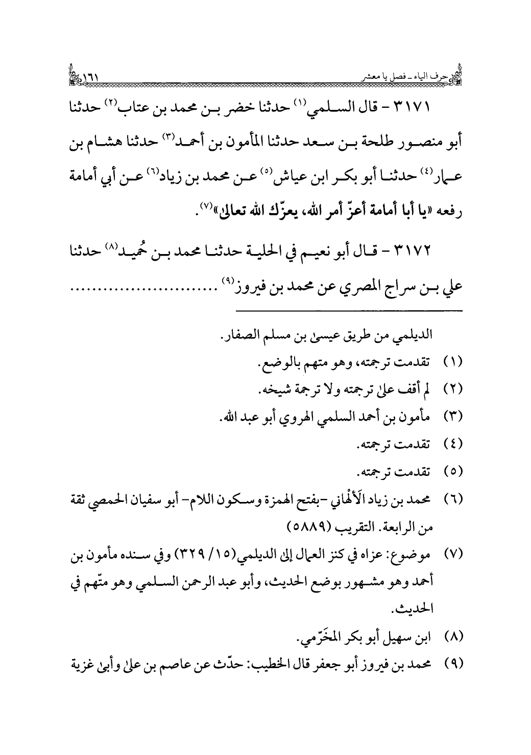٣١٧١ - قال السلمي (¬١) حدثنا خضر بن محمد بن عتاب (¬٢) حدثنا أبو منصور طلحة بن سعد حدثنا المأمون بن أحمد (¬٣) حدثنا هشام بن عمار (¬٤) حدثنا أبو بكر ابن عياش (¬٥) عن محمد بن زياد (¬٦) عن أبي أمامة رفعه "يا أبا أمامة أعزّ أمر الله، يعزّك الله تعالى" (¬٧).