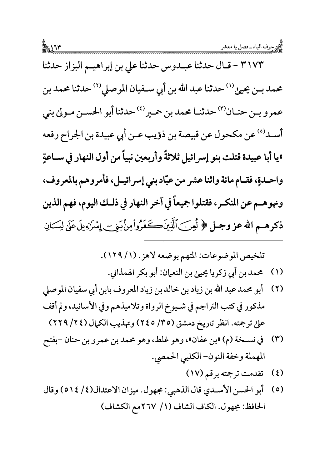 ٣١٧٣ - قال حدثنا عبدوس حدثنا علي بن إبراهيم البزاز حدثنا محمد بن يحيى (¬١) حدثنا عبد الله بن أبي سفيان الموصلي (¬٢) حدثنا محمد بن عمرو بن حنان (¬٣) حدثنا محمد بن حمير (¬٤) حدثنا أبو الحسن مولى بني أسد (¬٥) عن مكحول عن قبيصة بن ذؤيب عن أبي عبيدة بن الجراح رفعه "يا أبا عبيدة قتلت بنو إسرائيل ثلاثةً وأربعين نبيًا من أول النهار في ساعةٍ واحدةٍ، فقام مائة واثنا عشر من عبّاد بني إسرائيل، فأمروهم بالمعروف، ونهوهم عن المنكر، فقتلوا جميعًا في آخر النهار في ذلك اليوم، فهم الذين ذكرهم الله عز وجل {لُعِنَ الَّذِينَ كَفَرُوا مِنْ بَنِي إِسْرَائِيلَ عَلَى لِسَانِ