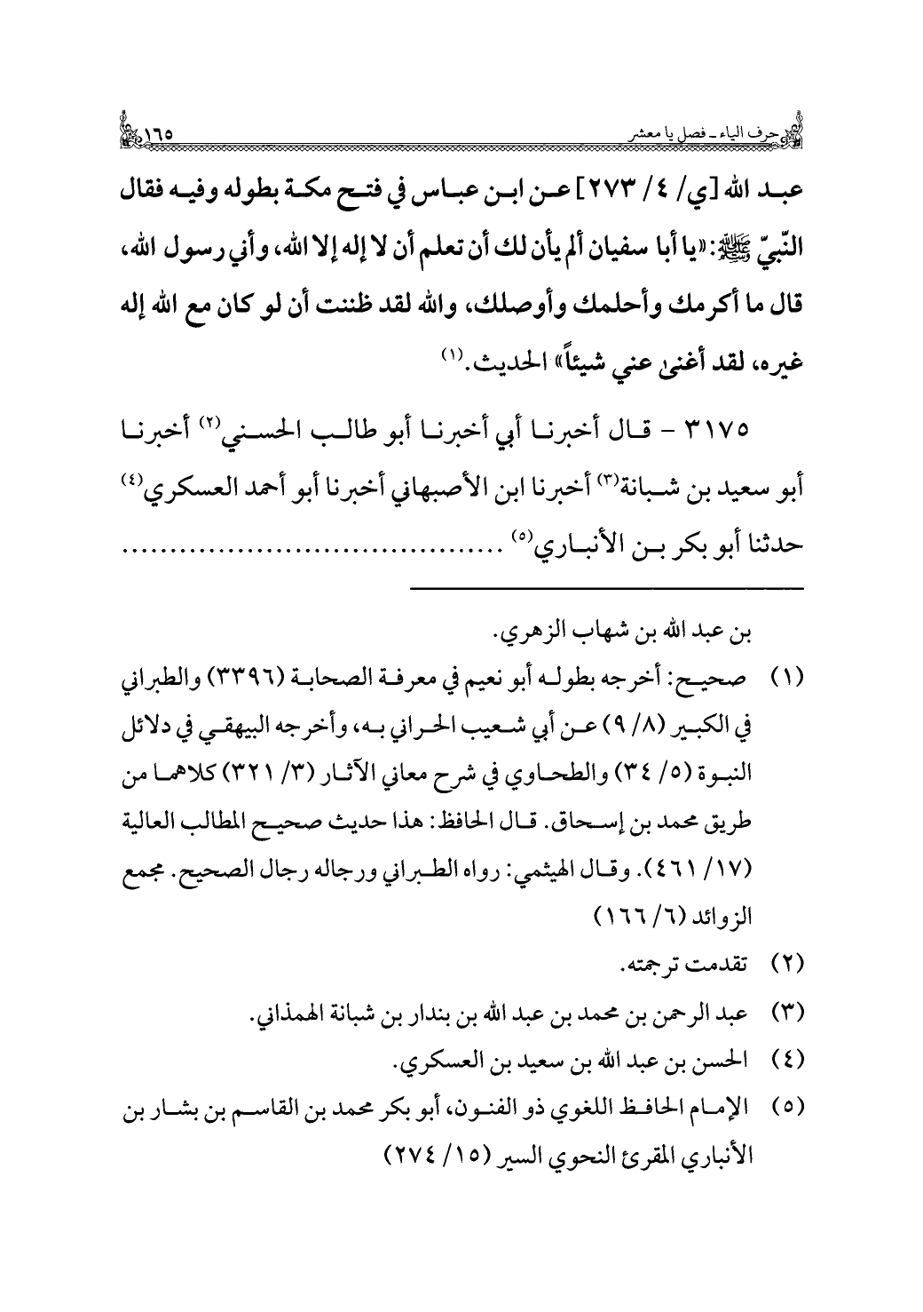 عبد الله عن ابن عباس في فتح مكة بطوله وفيه فقال النّبيّ - صلى الله عليه وسلم -: "يا أبا سفيان ألم يأن لك أن تعلم أن لا إله إلا الله، وأني رسول الله، قال ما أكرمك وأحلمك وأوصلك، والله لقد ظننت أن لو كان مع الله إله غيره، لقد أغنى عني شيئًا" الحديث. (¬١)