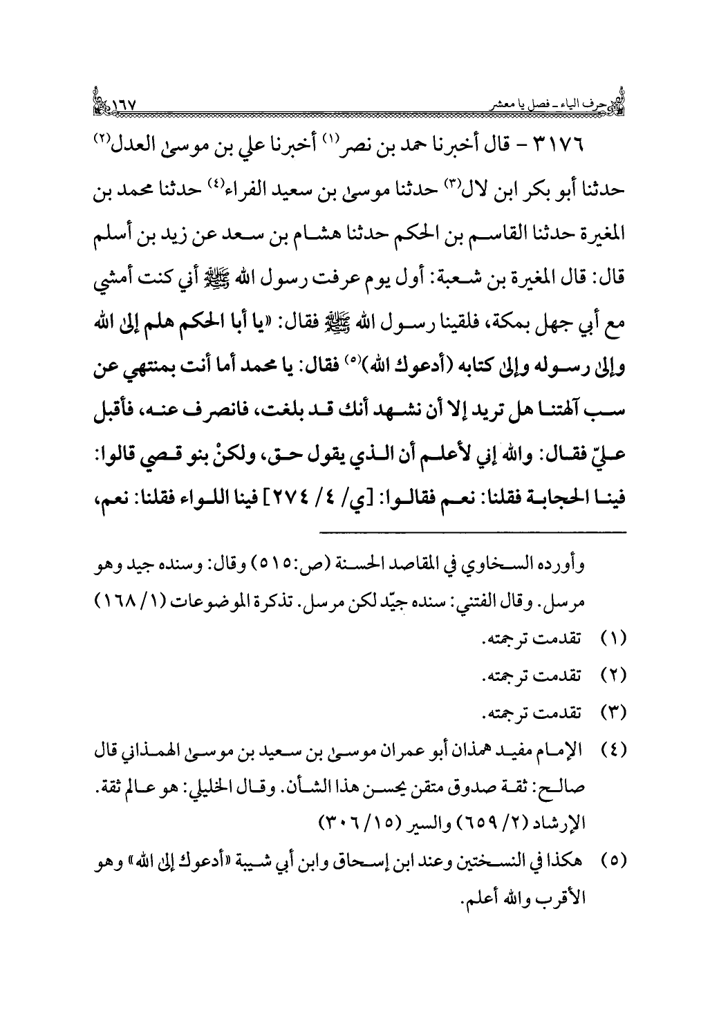 ٣١٧٦ - قال أخبرنا حمد بن نصر (¬١) أخبرنا علي بن موسى العدل (¬٢) حدثنا أبو بكر ابن لال (¬٣) حدثنا موسى بن سعيد الفراء (¬٤) حدثنا محمد بن المغيرة حدثنا القاسم بن الحكم حدثنا هشام بن سعد عن زيد بن أسلم قال: قال المغيرة بن شعبة: أول يوم عرفت رسول اللَّه -صلى اللَّه عليه وسلم- أني كنت أمشي مع أبي جهل بمكة، فلقينا رسول اللَّه -صلى اللَّه عليه وسلم- فقال: "يا أبا الحكم هلم إلى اللَّه وإلى رسوله وإلى كتابه (أدعوك اللَّه) (¬٥) فقال: يا محمد أما أنت بمنتهي عن سب آلهتنا هل تريد إلا أن نشهد أنك قد بلغت، فانصرف عنه، فأقبل عليّ فقال: واللَّه إني لأعلم أن الذي يقول حق، ولكنْ بنو قصي قالوا: فينا الحجابة فقلنا: نعم فقالوا: فينا اللواء فقلنا: نعم،