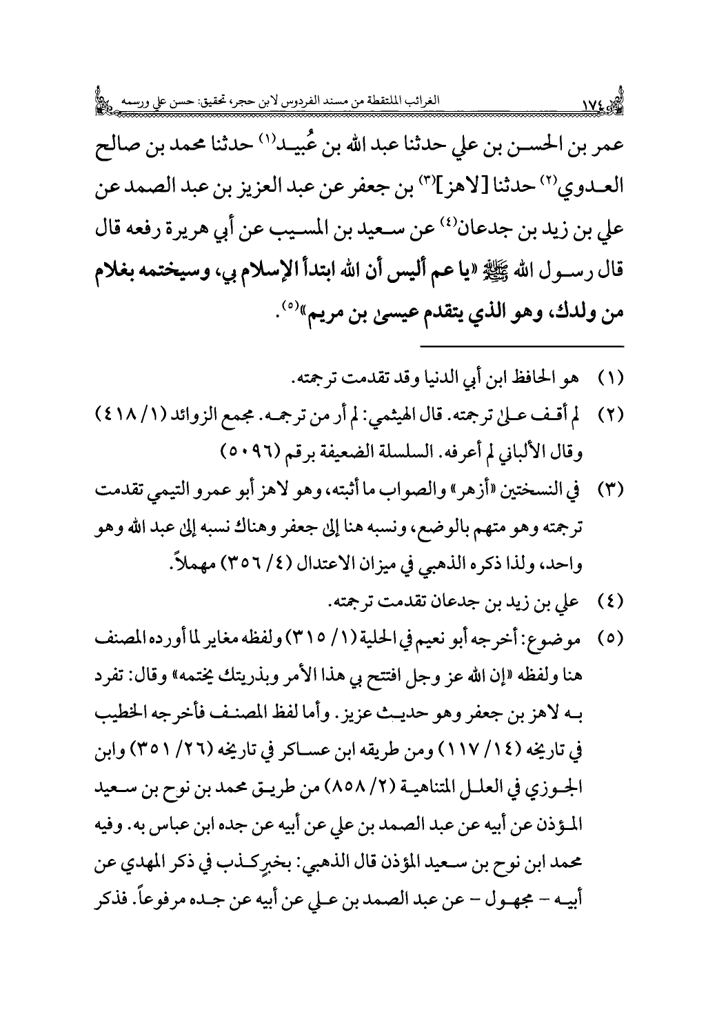عمر بن الحسن بن علي حدثنا عبد اللَّه بن عُبيد (¬١) حدثنا محمد بن صالح العدوي (¬٢) حدثنا [لاهز] (¬٣) بن جعفر عن عبد العزيز بن عبد الصمد عن علي بن زيد بن جدعان (¬٤) عن سعيد بن المسيب عن أبي هريرة رفعه قال قال رسول اللَّه -صلى اللَّه عليه وسلم- "يا عم أليس أن اللَّه ابتدأ الإسلام بي، وسيختمه بغلام من ولدك، وهو الذي يتقدم عيسى بن مريم" (¬٥).