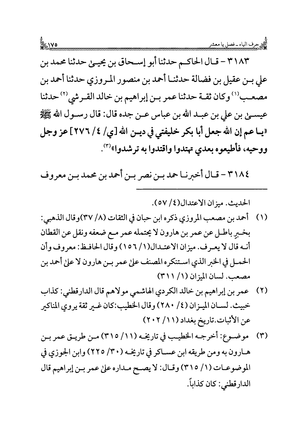 ٣١٨٣ - قال الحاكم حدثنا أبو إسحاق بن يحيى حدثنا محمد بن علي بن عُقيل بن فضالة حدثنا أحمد بن منصور المروزي حدثنا أحمد بن مصعب (¬١) وكان ثقة حدثنا عمر بن إبراهيم بن خالد القرشي (¬٢) حدثنا عيسى بن علي بن عبد اللَّه بن عباس عن جده قال: قال رسول اللَّه -صلى اللَّه عليه وسلم- "يا عم إن اللَّه جعل أبا بكر خليفتي في دين اللَّه عزَّ وجلَّ ووحيه، فاطيعوه بعدي تهتدوا واقتدوا به ترشدوا" (¬٣).