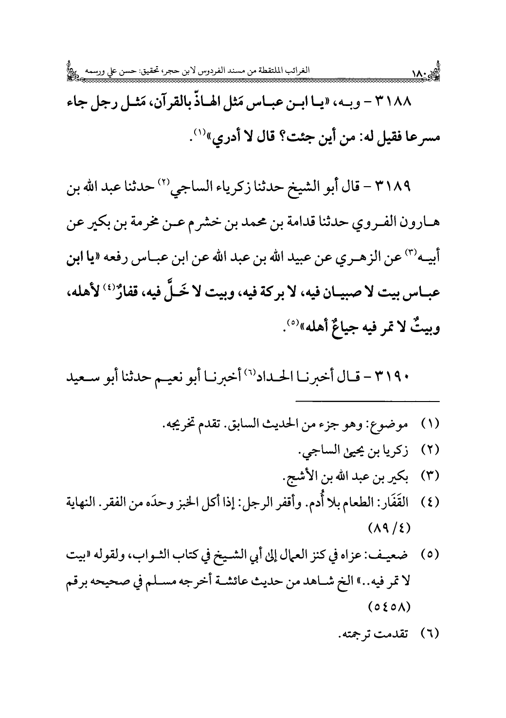 ٣١٨٩ - قال أبو الشيخ حدثنا زكرياء الساجي (¬٢) حدثنا عبد اللَّه بن هارون الفروي حدثنا قدامة بن محمد بن خشرم عن مخرمة بن بكير عن أبيه (¬٣) عن الزهري عن عبيد اللَّه بن عبد اللَّه عن ابن عباس رفعه "يا ابن عباس بيت لا صبيان فيه، لا بركة فيه، وبيت لا خَلّ فيه، قفارٌ (¬٤) لأهله، وبيتٌ لا تمر فيه جياعٌ أهله" (¬٥).