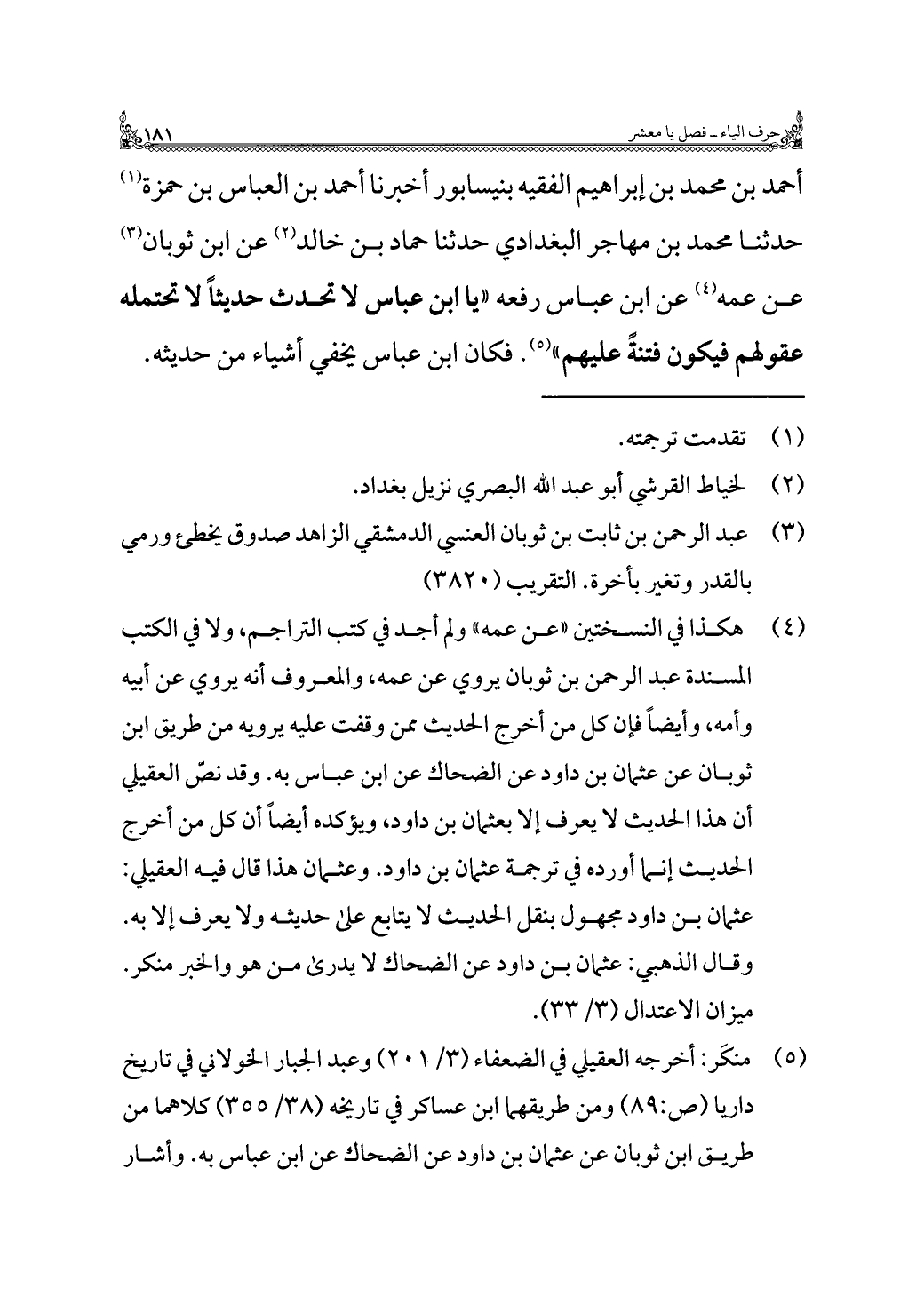 (¬٤) هكذا في النسختين "عن عمه" ولم أجد في كتب التراجم، ولا في الكتب المسندة عبد الرحمن بن ثوبان يروي عن عمه، والمعروف أنه يروي عن أبيه وأمه، وأيضًا فإن كل من أخرج الحديث ممن وقفت عليه يرويه من طريق ابن ثوبان عن عثمان بن داود عن الضحاك عن ابن عباس به. وقد نصّ العقيلي أن هذا الحديث لا يعرف إلا بعثمان بن داود، ويؤكده أيضًا أن كل من أخرج الحديث إنما أورده في ترجمة عثمان بن داود. وعثمان هذا قال فيه العقيلي: عثمان بن داود مجهول بنقل الحديث لا يتابع على حديثه ولا يعرف إلا به. وقال الذهبي: عثمان بن داود عن الضحاك لا يدري من هو والخبر منكر. ميزان الاعتدال (٣/ ٣٣).