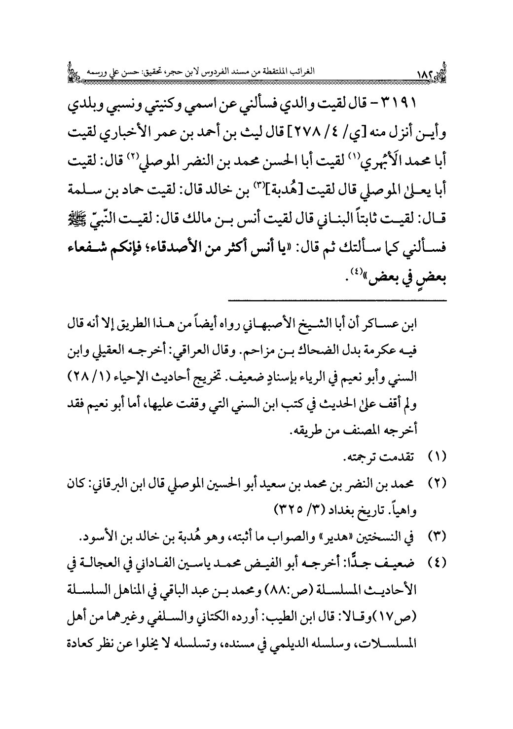 ٣١٩١ - قال لقيت والدي فسألني عن اسمي وكنيتي ونسبي وبلدي وأين أنزل منه قال ليث بن أحمد بن عمر الأخباري لقيت أبا محمد الأَبْهَري (¬١) لقيت أبا الحسن محمد بن النضر الموصلي (¬٢) قال: لقيت أبا يعلى الموصلي قال لقيت [هُدبة] (¬٣) بن خالد قال: لقيت حماد بن سلمة قال: لقيت ثابتًا البناني قال لقيت أنس بن مالك قال: لقيت النّبيّ -صلى اللَّه عليه وسلم- فسألني كما سألتك ثم قال: "يا أنس أكثر من الأصدقاء؛ فإنكم شفعاء بعضٍ في بعض" (¬٤).