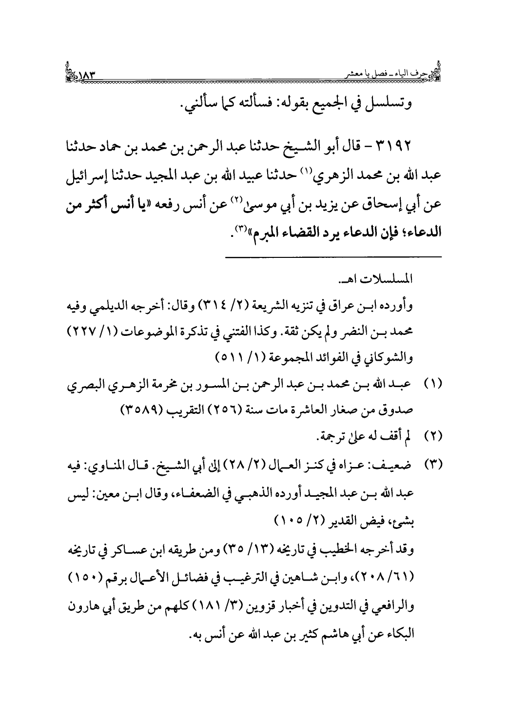 ٣١٩٢ - قال أبو الشيخ حدثنا عبد الرحمن بن محمد بن حماد حدثنا عبد اللَّه بن محمد الزهري (¬١) حدثنا عبيد اللَّه بن عبد المجيد حدثنا إسرائيل عن أبي إسحاق عن يزيد بن أبي موسى (¬٢) عن أنس رفعه "يا أنس أكثر من الدعاء؛ فإن الدعاء يرد القضاء المبرم" (¬٣).