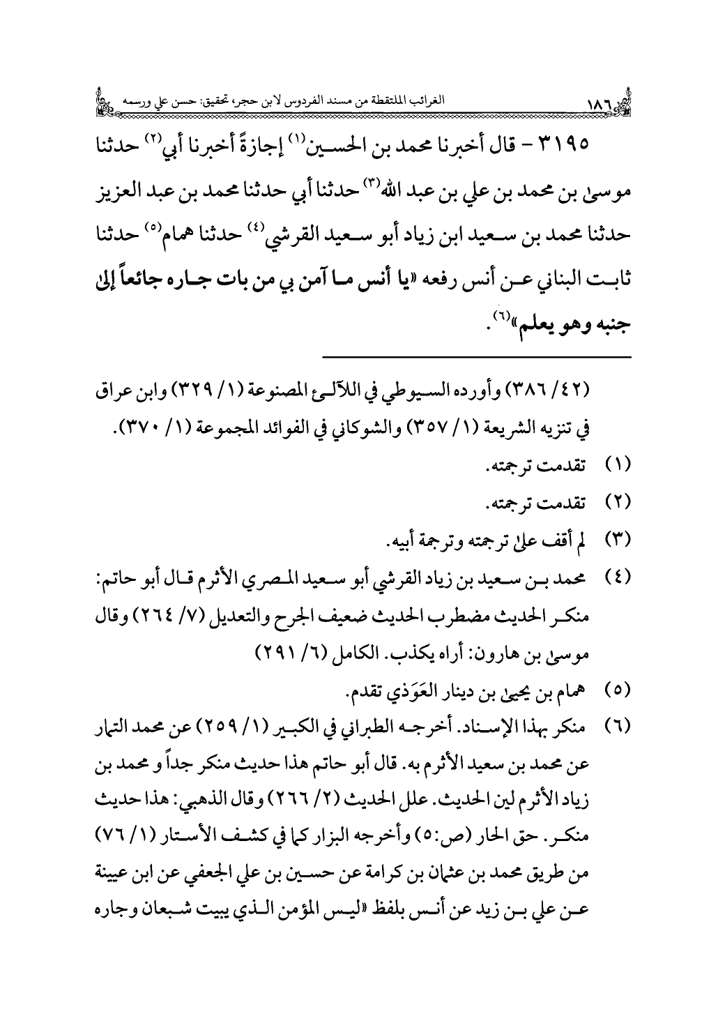٣١٩٥ - قال أخبرنا محمد بن الحسين (¬١) إجازةً أخبرنا أبي (¬٢) حدثنا موسى بن محمد بن علي بن عبد اللَّه (¬٣) حدثنا أبي حدثنا محمد بن عبد العزيز حدثنا محمد بن سعيد ابن زياد أبو سعيد القرشي (¬٤) حدثنا همام (¬٥) حدثنا ثابت البناني عن أنس رفعه "يا أنس ما آمن بي من بات جاره جائعًا إلى جنبه وهو يعلم" (¬٦).