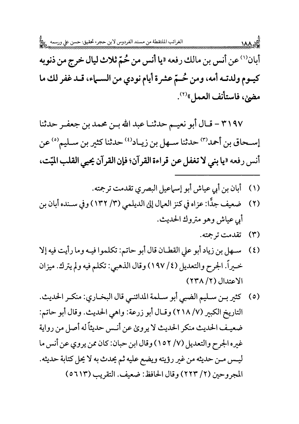 ٣١٩٧ - قال أبو نعيم حدثنا عبد اللَّه بن محمد بن جعفر حدثنا إسحاق بن أحمد (¬٣) حدثنا سهل بن زياد (¬٤) حدثنا كثير بن سليم (¬٥) عن أنس رفعه "يا بني لا تغفل عن قراءة القرآن؛ فإن القرآن يحيي القلب الميّت،