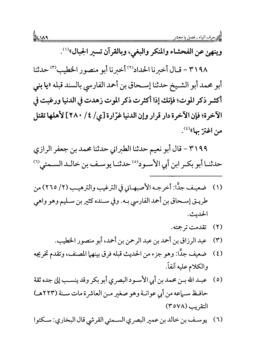 ٣١٩٨ - قال أخبرنا الحداد (¬٢) أخبرنا أبو منصور الخطيب (¬٣) حدثنا أبو محمد أبو الشيخ حدثنا إسحاق بن أحمد الفارسي بالسند قبله "يا بني أكثر ذكر الموت؛ فإنك إذا أكثرت ذكر الموت زهدت في الدنيا ورغبت في الآخرة؛ فإن الآخرة دار قرار وإن الدنيا غرّارة لأهلها تقتل من اغترّ بها" (¬٤).