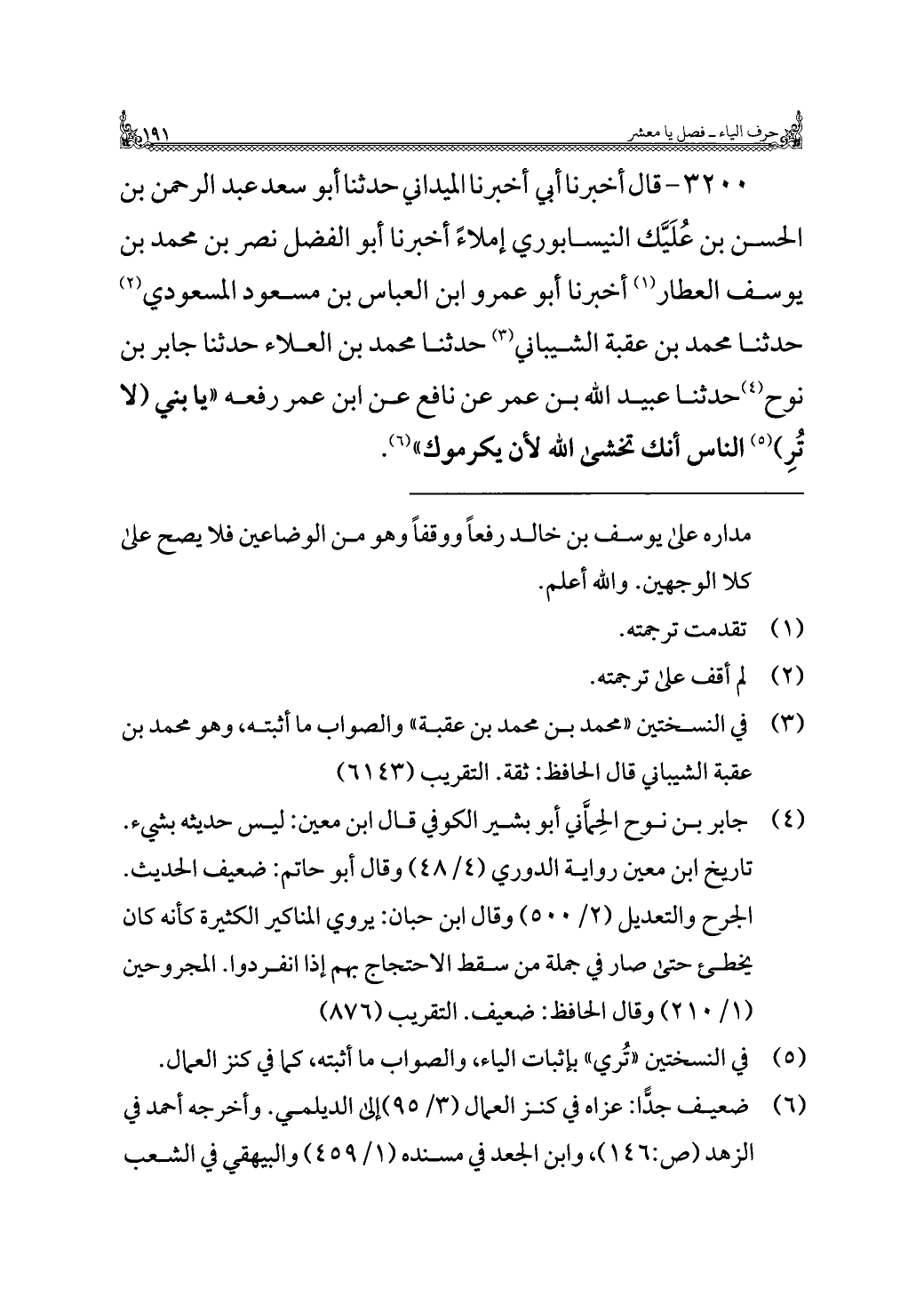 ٣٢٠٠ - قال أخبرنا أبي أخبرنا الميداني حدثنا أبو سعد عبد الرحمن بن الحسن بن عُلَيَّك النيسابوري إملاءً أخبرنا أبو الفضل نصر بن محمد بن يوسف العطار (¬١) أخبرنا أبو عمرو ابن العباس بن مسعود المسعودي (¬٢) حدثنا محمد بن عقبة الشيباني (¬٣) حدثنا محمد بن العلاء حدثنا جابر بن نوح (¬٤) حدثنا عبيد اللَّه بن عمر عن نافع عن ابن عمر رفعه "يا بني ألا تُرِ) (¬٥) الناس أنك تخشى اللَّه لأن يكرموك" (¬٦).