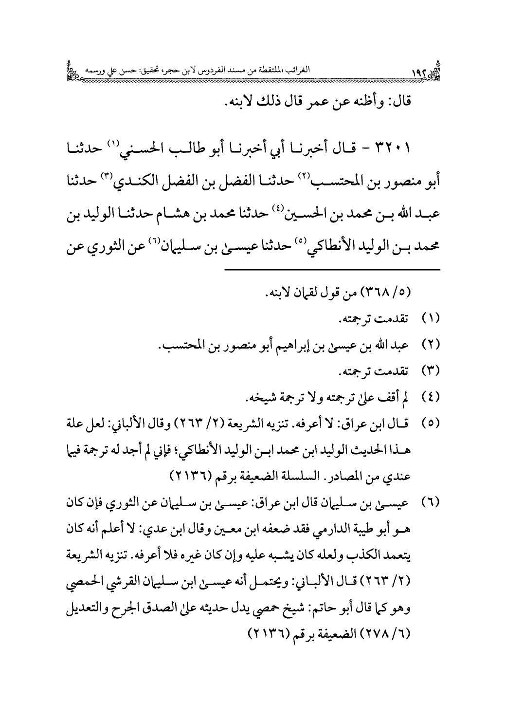 (¬٦) عيسى بن سليمان قال ابن عراق: عيسى بن سليمان عن الثوري فإن كان هو أبو طيبة الدارمي فقد ضعفه ابن معين وقال ابن عدي: لا أعلم أنه كان يتعمد الكذب ولعله كان يشبه عليه وإن كان غيره فلا أعرفه. تنزيه الشريعة (٢/ ٢٦٣) قال الألباني: ويحتمل أنه عيسى ابن سليمان القرشي الحمصي وهو كما قال أبو حاتم: شيخ حمصي يدل حديثه على الصدق الجرح والتعديل (٦/ ٢٧٨) الضعيفة برقم (٢١٣٦).