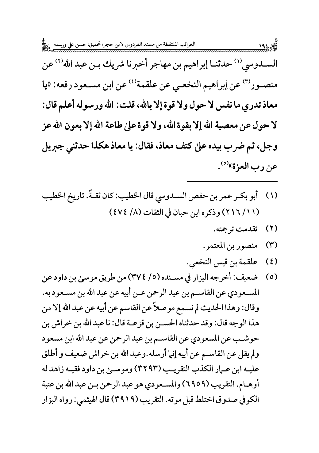 السدوسي (¬١) حدثنا إبراهيم بن مهاجر أخبرنا شريك بن عبد اللَّه (¬٢) عن منصور (¬٣) عن إبراهيم النخعي عن علقمة (¬٤) عن ابن مسعود رفعه: "يا معاذ تدري ما نفس لا حول ولا قوة إلا باللَّه، قلت: اللَّه ورسوله أعلم قال: لا حول عن معصية اللَّه إلا بقوة اللَّه، ولا قوة على طاعة اللَّه إلا بعون اللَّه عز وجل، ثم ضرب بيده على كتف معاذ، فقال: يا معاذ هكذا حدثني جبريل عن رب العزة" (¬٥).