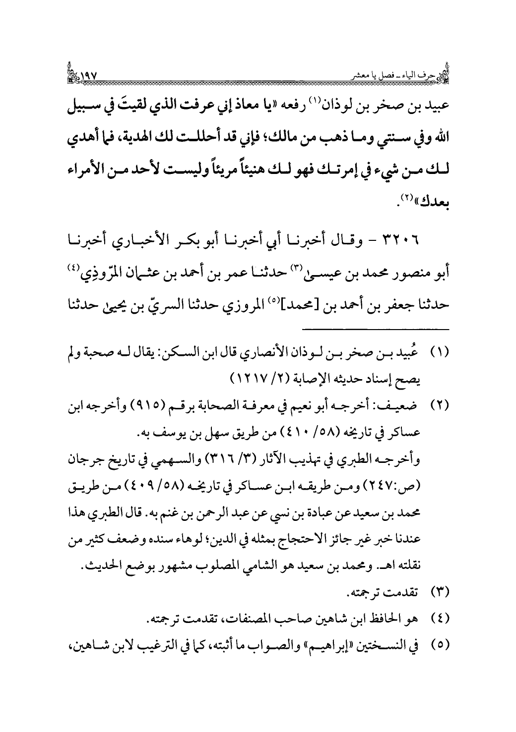 عبيد بن صخر بن لوذان (¬١) رفعه "يا معاذ إني عرفت الذي لقيتَ في سبيل اللَّه وفي سنتي وما ذهب من مالك؛ فإني قد أحللت لك الهدية، فما أهدي لك من شيء في إمرتك فهو لك هنيئًا مريئًا وليست لأحد من الأمراء بعدك" (¬٢).
