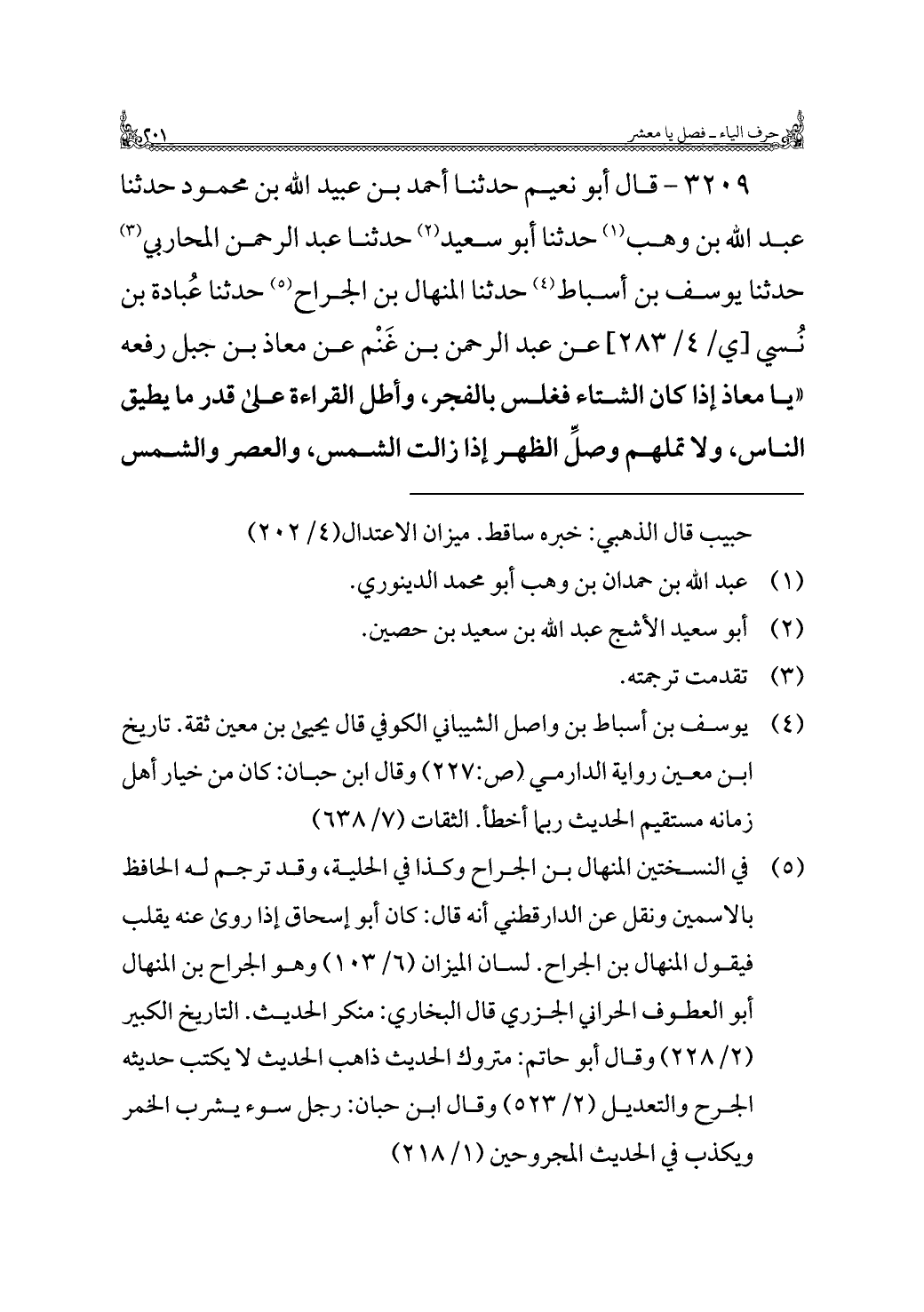 ٣٢٠٩ - قال أبو نعيم حدثنا أحمد بن عبيد اللَّه بن محمود حدثنا عبد اللَّه بن وهب (¬١) حدثنا أبو سعيد (¬٢) حدثنا عبد الرحمن المحاربي (¬٣) حدثنا يوسف بن أسباط (¬٤) حدثنا المنهال بن الجراح (¬٥) حدثنا عُبادة بن نُسي عن عبد الرحمن بن غنم عن معاذ بن جبل رفعه "يا معاذ إذا كان الشتاء فغلس بالفجر، وأطل القراءة على قدر ما يطيق الناس، ولا تملهم وصلِّ الظهر إذا زالت الشمس، والعصر والشمس