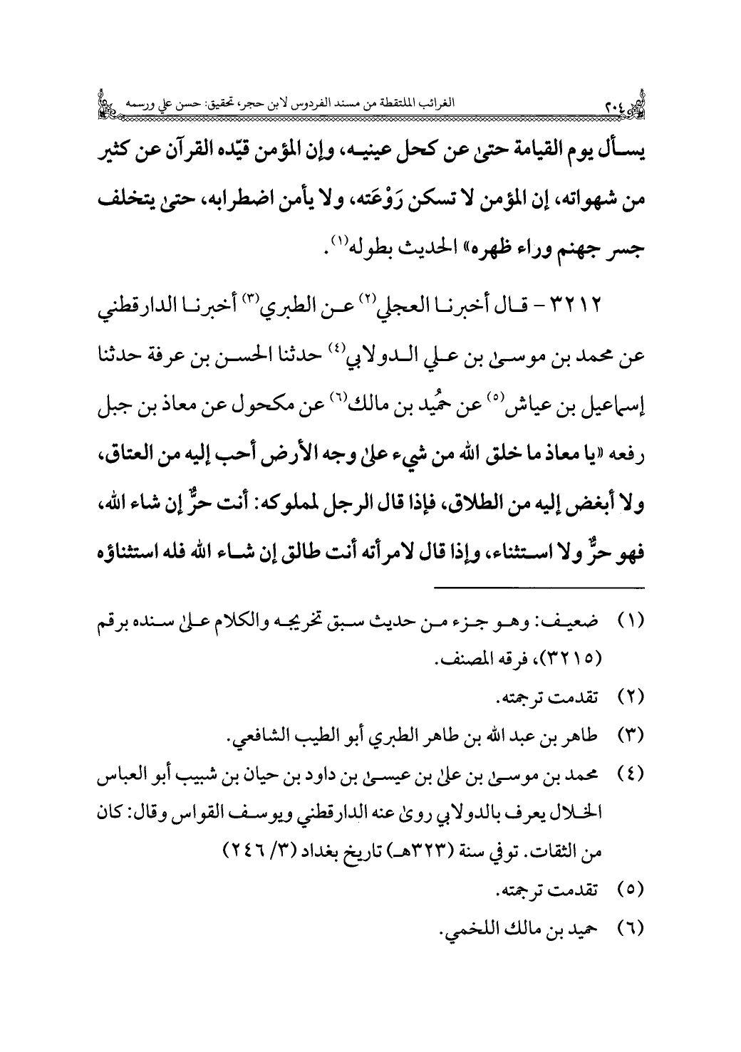 ٣٢١٢ - قال أخبرنا العجلي (¬٢) عن الطبري (¬٣) أخبرنا الدارقطني عن محمد بن موسى بن علي الدولابي (¬٤) حدثنا الحسن بن عرفة حدثنا إسماعيل بن عياش (¬٥) عن حُميد بن مالك (¬٦) عن مكحول عن معاذ بن جبل رفعه "يا معاذ ما خلق اللَّه من شيء على وجه الأرض أحب إليه من العتاق، ولا أبغض إليه من الطلاق، فإذا قال الرجل لمملوكه: أنت حر إن شاء اللَّه، فهو حرٌّ ولا استثناء، وإذا قال لامرأته أنت طالق إن شاء اللَّه فله استثناؤه