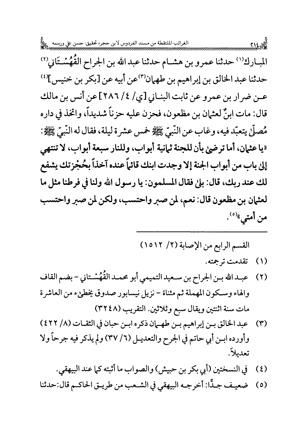 المبارك (¬١) حدثنا عمرو بن هشام حدثنا عبد اللَّه بن الجراح القُهُسْتَاني (¬٢) حدثنا عبد الخالق بن إبراهيم بن طهمان (¬٣) عن أبيه عن [بكر بن خنيس] (¬٤) عن ضرار بن عمرو عن ثابت البناني عن أنس بن مالك قال: مات ابنٌ لعثمان بن مظعون، فحزن عليه حزنًا شديدًا، واتخذ في داره مُصلّى يتعبّد فيه، وغاب عن النّبيّ -صلى اللَّه عليه وسلم- خمس عشرة ليلة، فقال له النّبيّ -صلى اللَّه عليه وسلم-: "يا عثمان، أما ترضى بأن للجنة ثمانية أبواب، وللنار سبعة أبواب، لا تنتهي إلى باب من أبواب الجنة إلا وجدت ابنك قائمًا عنده آخذًا بحُجْزتك يشفع لك عند ربك، قال: بك فقال المسلمون: يا رسول اللَّه ولنا في فرطنا مثل ما لعثمان بن مظعون قال: نعم، لمن صبر واحتسب، ولكن لمن صبر واحتسب من أمتي" (¬٥).
