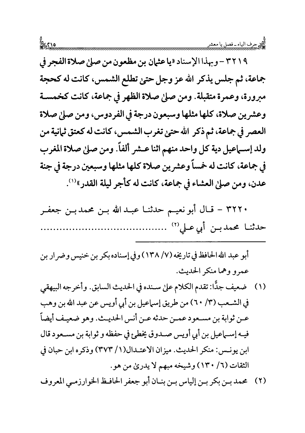 ٣٢١٩ - وبهذا الإسناد "يا عثمان بن مظعون من صلى صلاة الفجر في جماعة، ثم جلس يذكر اللَّه عزَّ وجلَّ حتى تطلع الشمس، كانت له كحجة مبرورة، وعمرة متقبلة. ومن صلى صلاة الظهر في جماعة، كانت كخمسة وعشرين صلاة، كلها مثلها وسبعون درجة في الفردوس، ومن صلى صلاة العصر في جماعة، ثم ذكر اللَّه حتى تغرب الشمس، كانت له كعتق ثمانية من ولد إسماعيل دية كل واحد منهم اثنا عشر ألفًا. ومن صلى صلاة المغرب في جماعة، كانت له خمسًا وعشرين صلاة كلها مثلها وسبعين درجة في جنة عدن، ومن صلى العشاء في جماعة، كانت له كأجر ليلة القدر" (¬١).