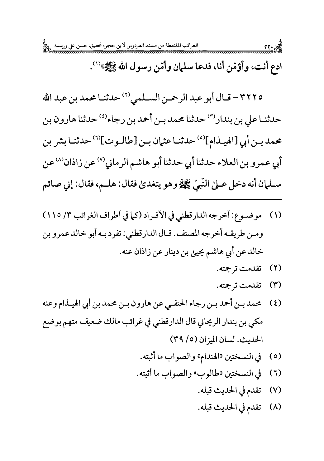 ٣٢٢٥ - قال أبو عبد الرحمن السلمي (¬٢) حدثنا محمد بن عبد اللَّه حدثنا علي بن بندار (¬٣) حدثنا محمد بن أحمد بن رجاء (¬٤) حدثنا هارون بن محمد بن أبي [الهيذام] (¬٥) حدثنا عثمان بن [طالوت] (¬٦) حدثنا بشر بن أبي عمرو بن العلاء حدثنا أبي حدثنا أبو هاشم الرماني (¬٧) عن زاذان (¬٨) عن سلمان أنه دخل على النّبيّ -صلى اللَّه عليه وسلم- وهو يتغدى فقال: هلم، فقال: إني صائم