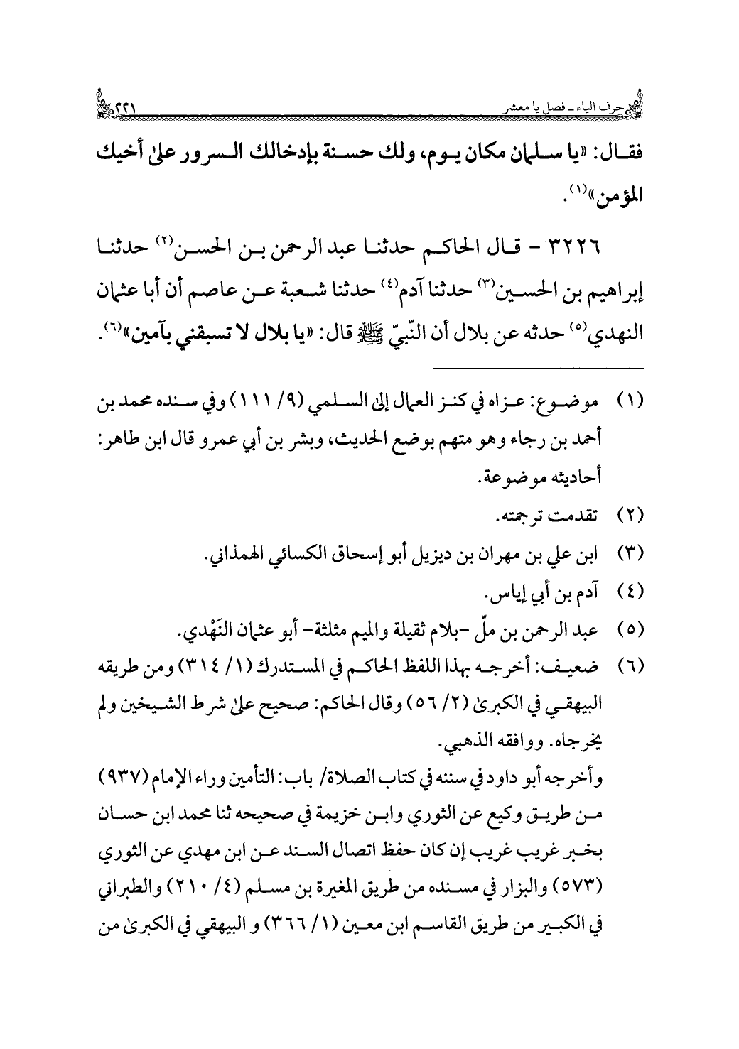 ٣٢٢٦ - قال الحاكم حدثنا عبد الرحمن بن الحسن (¬٢) حدثنا إبراهيم بن الحسين (¬٣) حدثنا آدم (¬٤) حدثنا شعبة عن عاصم أن أبا عثمان النهدي (¬٥) حدثه عن بلال أن النّبيّ -صلى اللَّه عليه وسلم- قال: "يا بلال لا تسبقني بآمين" (¬٦).