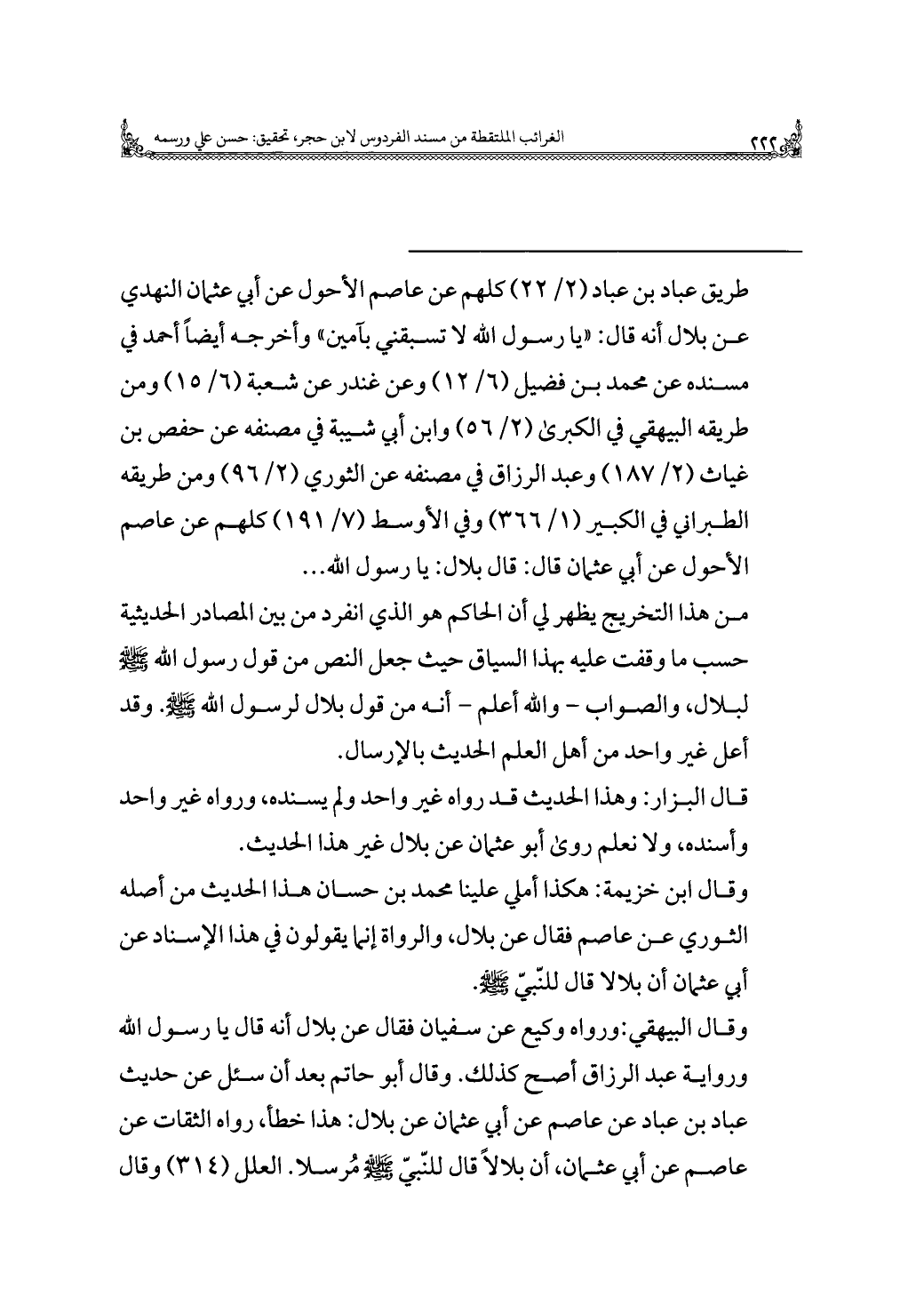 وقال البيهقي: ورواه وكيع عن سفيان فقال عن بلال أنه قال يا رسول اللَّه ورواية عبد الرزاق أصح كذلك. وقال أبو حاتم بعد أن سئل عن حديث عباد بن عباد عن عاصم عن أبي عثمان عن بلال: هذا خطأ، رواه الثقات عن عاصم عن أبي عثمان، أن بلالًا قال للنّبيّ -صلى اللَّه عليه وسلم- مُرسلا. العلل (٣١٤) وقال =