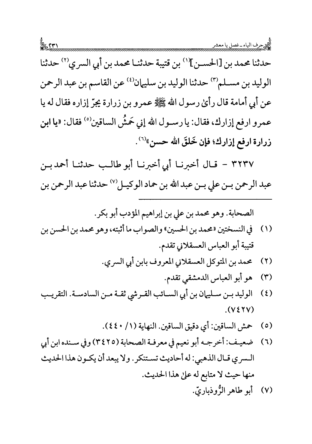 حدثنا محمد بن [الحسن] (¬١) بن قتيبة حدثنا محمد بن أبي السري (¬٢) حدثنا الوليد بن مسلم (¬٣) حدثنا الوليد بن سليمان (¬٤) عن القاسم بن عبد الرحمن عن أبي أمامة قال رأى رسول اللَّه -صلى اللَّه عليه وسلم- عمرو بن زرارة يجرّ إزاره فقال له يا عمرو ارفع إزارك، فقال: يا رسول اللَّه إني حَمشُ الساقين (¬٥) فقال: "يا ابن زرارة ارفع إزارك؛ فإن خَلقَ اللَّه حسن" (¬٦).